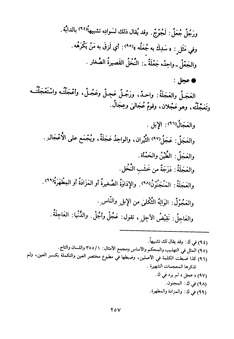 ورَجُلٌ جُعَل : لَجوْج . وقد يُقال ذلك لسَوادِه تشبيهاً بالدابة . وفي مَثَل : ' سَمِكَ به جعَلُه ' : أي لَزقَ به منْ يكْرَهُه . والجَعْلُ - واحدُه جعْلَة - : النخْلُ القصيرةُ الصغار . عجل العَجَلُ والعَجَلة : واحد ، ورَجُلٌ عَجِلٌ وعَجُلٌ ، وأعجلته واسْتعجَلتُه وتَعجلْتُه ، وهو عَجلان ، وقوم عًجَالى وعِجَال . والعَجَالُ : الإبل . والعَجَلُ : عَجَلُ الثيْران ، والواحِدُ عَجلَةٌ ، وتجْمَع على الأعْجَال . والعَجَلُ : الطيْنُ والحَمْأة . والعَجَلَةُ : درَجَةٌ من خَشَبِ النخْل . والعَجَلَةُ : المْجَنُوْنُ . والإدَاوَةُ الصَّغيرةُ أو المَزَادةُ أو المِطْهَرَةُ والعَجُوْلُ : الوَالِهُ الثكْلى من الإبلوالناس . والعَاجِلُ : نَقِيْضُ الآجِل ، تقول : عجل وأجلْ . والدنْيا : العَاجِلَةُ .