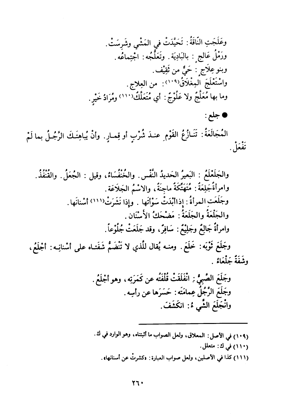 وعَلَجَتِ النّاقَةُ : تَحَيَّدَتْ في المَشْي وشَرِسَتْ . ورَمْلُ عَالجٍ : بالبَادِيَة . وتَعَلُجُه : اجْتِماعُه . وبنو عِلاجٍ : حَي من ثَقِيْف . واسْتَعْلَجَ المِغْلاَق : من العِلاج . وما بها مُعَلَجٌ ولا عَلُوْجٌ : أي مُتَعَلَكٌ ومُرَاد ُخَيْرٍ . جلع المُجَالَعَةُ : تَنَازُعُ القَوْم عندَ شُرْبٍ أو قِمارٍ . وأنْ يُباهِتَكَ الرجُلُ بما لَمْ تفعل . والجَلَعْلَعُ : البَعيرُ الحَديد النَفْس . والخُنْفُسَاءُ ، وقيل : الجُعَلُ . والقُنْفُذُ . وامرأةٌ جَلِعَة : مُتَهَتَكَةٌ ماجِنَةٌ ، والاسْمُ الجَلاعَة . وجَلَعَتِ المرأةُ : إِذ ا أبْدَتْ سَوْأتَها . وإذا نَشَرَتْ أسْنانَها . والجَلْعَةُ والجَلَعَةُ : مَضْحَكُ الأسْنَان . وامرأة جَالِعٌ وجَلِيْعٌ : سَافِرٌ ، وقد جَلَعَتْ جُلُوْعاً . وجَلَعَ ثَوْبَه : خَلَعَ . ومنه يُقال للذي لا تَنْضَم شَفَتاه على أسْنانِه : أجْلَعُ ، وشَفَةٌ جَلْعاءُ . وجَلَعَ الصبي : انْفَلَقَتْ قُلْفَتُه عن كَمَرَتِه ، وهو أجْلَعُ . وجلع الرجُلُ عِمامَتَه : حَسَرَها عن رأسِه . وانجَلَعَ الشيءُ : انكَشَف .