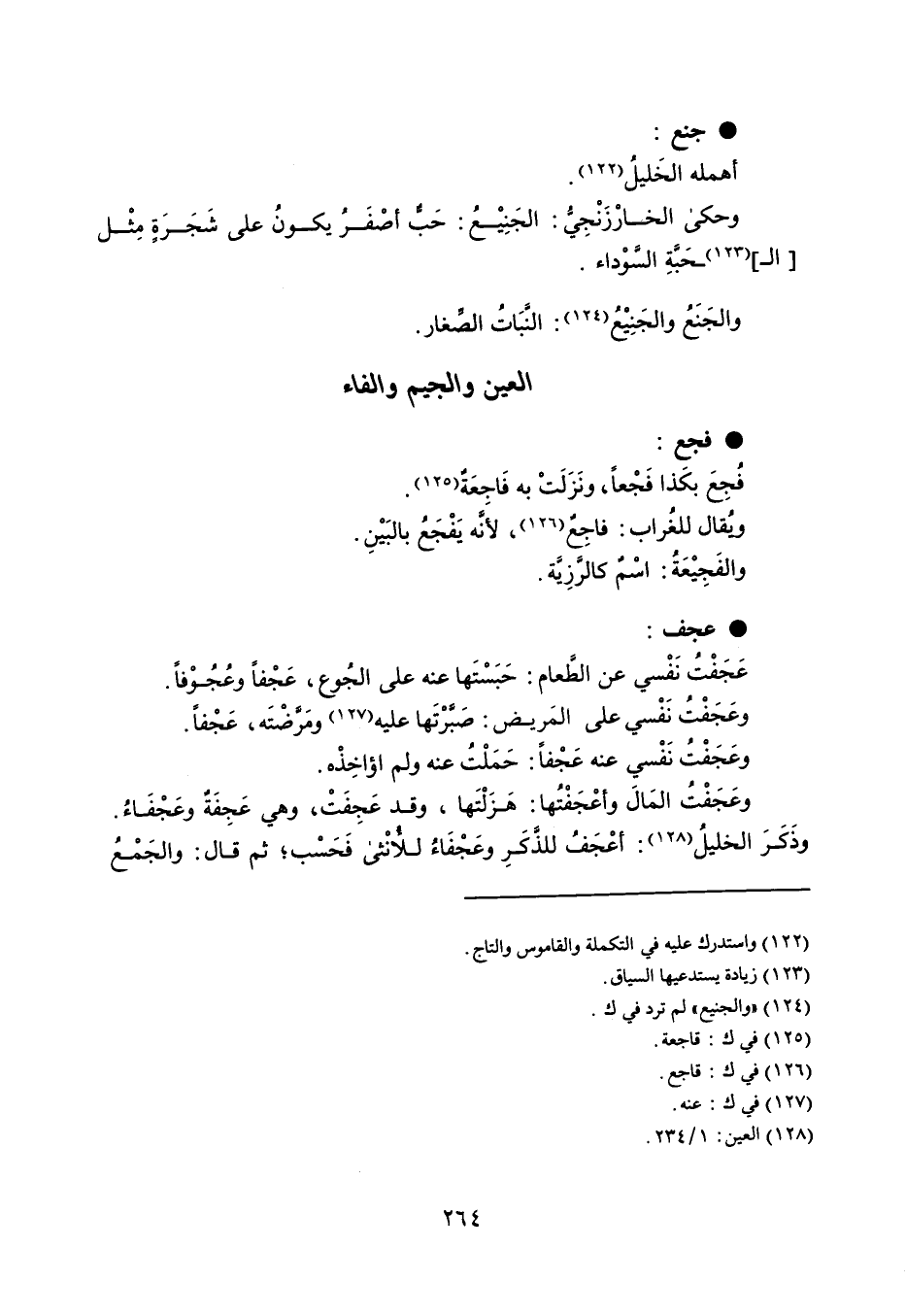 فجع فُجِعَ بكَذا فَجْعاً ، ونَزَلَتْ به فَاجِعَة . ؤيقال للغراب : فاجِع ، لأنَه يَفْجَعُ بالبَيْنِ . والفَجِيْعَةُ : اسم كالرزِيًة . عجف عَجَفْتُ نَفسي عن الطعام : حَبَسْتَها عنه على الجُوع ، عَجْفاً وعُجُوْفاً . وعجًفْتُ نَفْسي على المَريض : صَبرْتَها عليه ومَرضْتَه ، عَجْفاً . وعَجَفْت نَفْسي عنه عَجْفاً : حَمَلْتُ عنه ولم أؤاخِذْه . وعَجَفْتُ المَالَ وأعْجَفْتُها : هَزَلْتَها ، وقد عَجفَتْ ، وهي عَجِفَة وعَجْفَاءُ . وذَكَرَ الخليلُ : أعْجَف للذكَرِ وعَجْفَاءُ للأنْثى فَحَسْب ؛ ثم قال : والجَمْعُ