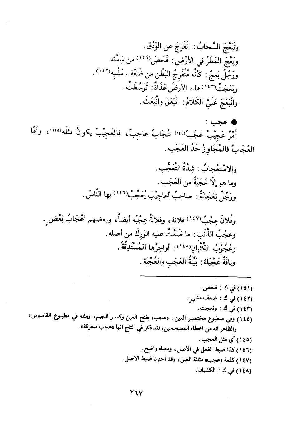 وتَبعجَ السَّحابُ : انْفَرَجَ عن الودْق . وبَعجَ المَطَرُ في الأرْض : فَحَصَ من شِدَته . ورَجل بَعِج : كأنَه مُنْفَرِجُ البَطْن من ضَعْف مَشْيِه وبَعَجَتْ هذه الأرض عَذَاةٌ : تَوَسَطَت . وانْبَعَجَ عَلَيً الكَلامُ : انْبعَقَ وانْبَعَثَ . عجب أمْرٌ عَجِيب عجَبٌ ، عًجَاب عاجب ، فالعَجِيب يكون مثلَه ، وأما العُجَابُ فالمُجَاوِزُ حَد العَجَب . والاسْتِعْجابُ : شدًةُ التَعَجب . وما هو إلا عَجَبَة من العَجَب . ورَجُلٌ تِعْجَابَةٌ : صاحِبُ أعاجِيْبَ يُعَجبُ بها الناسَ . وفُلان عِجْبُ فلانة ، وفلانَةُ عِجْبُه أيضاً ، وبعضهم أعْجَابُ بَعْض . وعَجْبُ الذَنَبِ : ما ضَمًتْ عليه الوَرِكَ من أصله . وعُجُوْبُ الكُثْبانِ : أواخِرها المستَدِقةُ . وناقَة عَجْبَاءُ : بَينَةُ العَجَبِ والعُجْبَة .