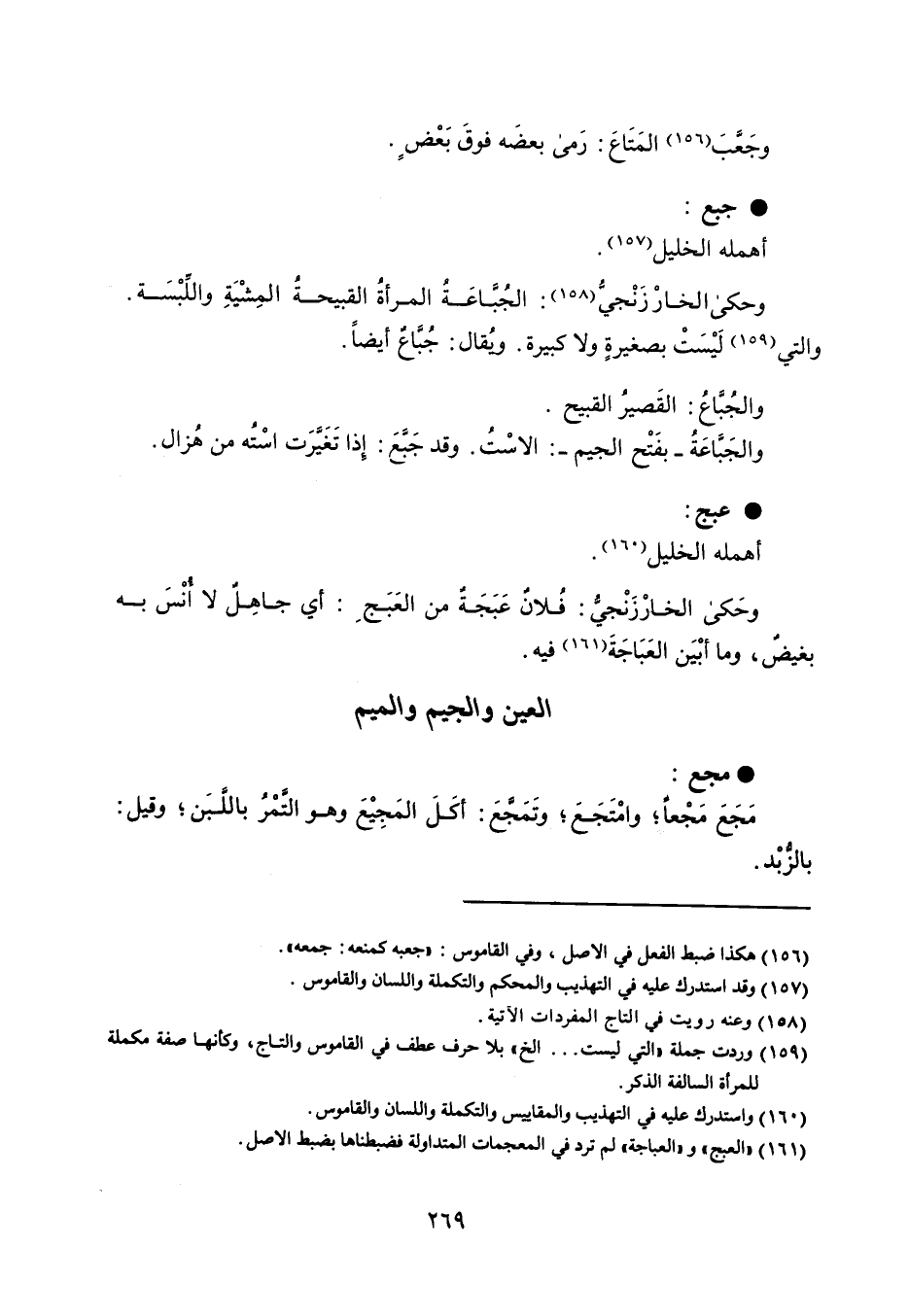 وجَعَّبَ المَتَاعَ : رَمى بعضَه فوقَ بَعْضٍ . جبع أهمله الخليل . وحكى الخارْزَنْجيُ : الجُباعَةُ المرأةُ القبيحةُ المِشْيَةِ واللَبْسَة . والتي لَيْسَتْ بصغيرةٍ ولا كبيرة . ويُقال : جُبَّاعٌ أيضاً . والجُباعُ : القَصيرُ القبيح . والجَبًاعَةُ - بفَتْح الجيم - : الاسْتُ . وقد جَبع : إِذا تَغيرَت اسْتُه من هُزال . عبج أهمله الخليل . وحَكى الخارْزَنْجيُّ : فُلان عَبَجَة من العَبَج أي جاهِلٌ لا أنْسَ به بغيضٌ ، وما أبْيَن العَبَاجَةَ فيه .