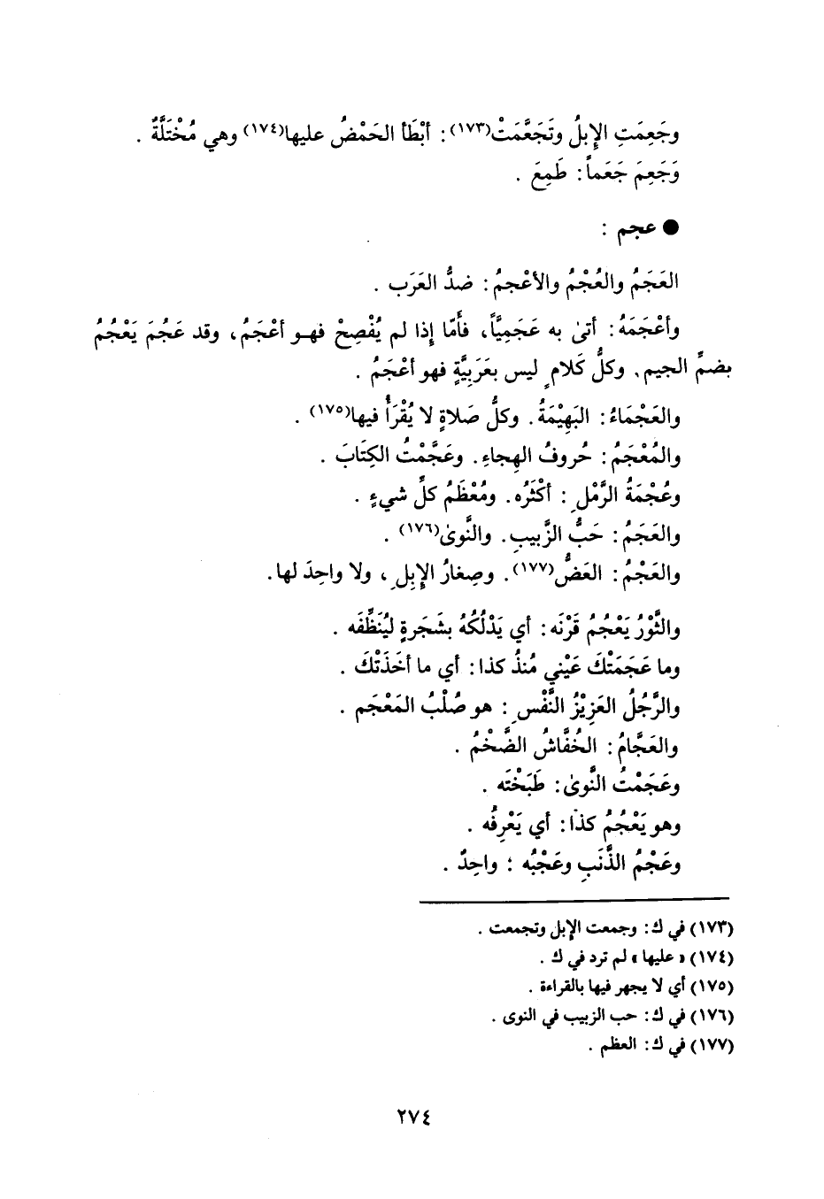وجَعِمَت الإبل وتَجَعَّمَتْ : أبْطَأ الحَمْضُ عليها وهي مُخْتَلةٌ . وَجَعِمَ جَعَماً : طَمِعَ . عجم العَجَمُ والعُجْمُ والأعْجمُ : ضدُ العَرَب . وأعْجَمَهُ : أتى به عَجَمِيَاَ ، فأما إِذا لم يُفْصِحْ فهو أعْجَمُ ، وقد عَجُمَ يَعْجُمُ بضمِّ الجيم وكلُّ كَلام ليس بعَرَبِيةٍ فهو أعْجَمُ . والعَجْمَاءُ : البَهِيْمَةُ . وكلُّ صَلاة لا يُقْرأ فيها . والمُعْجَمُ : حُروفُ الهِجاءِ . وعَجمْتُ الكِتَابَ . وعُجْمَةُ الرمْل : أكْثَرُه . ومُعْظَمُ كل شيءٍ . والعَجَمُ : حب الزًبيبِ . والنوى . والعَجْمُ : العضً . وصِغارُ الإبِل ، ولا واحِدَ لها . والثوْر ُيَعْجُمُ قَرْنَه : أي يَدْلُكُهُ بشَجَرةٍ ليُنظفَه . وما عَجَمَتْكَ عَيْني مُنذُ كذا : أي ما أخَذَتْكَ . والرجُلُ العَزِيْزُ النفْس : هو صُلْبُ المَعْجَم . والعَجامُ : الخُفاشُ الضخْمُ . وعَجمتُ النوى : طبَخْتَه . وهو يَعْجُمُ كذا : أي يَعْرِفه . وعَجمُ الذنبِ وعَجْبُه : واحِدٌ .