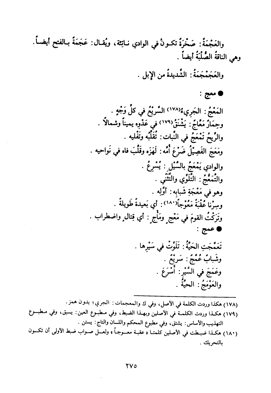 والعجمَة : صَخْرَة تكونُ في الوادي ناتِئة ، ويُقال : عَجَمَة بالفتح أيضاً . وهي الناقةُ الصلبَةُ أيضاً . والعَجَمْجَمَةُ : الشديدةُ من الإبل . معج المَعْجُ : الجَرِيءُ السريْعُ في كل وَجْهٍ . وحِمَارٌ معاجٌ : يَشْنَقُ في عَدوه يميناً وشمالاً . والريحُ تَمْعَجُ في النبات : تُقلبُه وتَفْليه . ومَعَجَ الفَصِيْلُ ضَرْعَ أمه : لَهَزَه وقلبَ فاه في نَواحيه . والوادي يَمْعَجُ بالسيْل : يُسْرِعُ . والتمعجُ : التلوي والتثَني . وهو في مَعْجَةِ شَبابِه : أوله . وسِرْنا عُقْبَةً مَعُوْجاً : أي بَعيدةً طَويلةً . وتَرَكْتُ القومَ في مَعْج ومَأج : أي قِتال واضطراب . عمج تَعَمَّجَتِ الحَيةُ : تَلوتْ في سَيْرِها . وشَبابٌ عُمجٌ : سَريعٌ . وعَمَجَ في السَّيْرِ : أسرع . والعَوْمَجُ : الحيةُ .