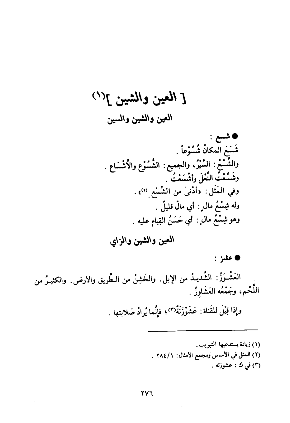 شسع شَسعَ المكانُ شسوْعاً . والشسعُ : السيْرُ ، والجميع : الشسوْع والأشْسَاع . وشَسعْتُ النعْلَ وأشْسَعْتُ . وفي المَثَل : أدْنا من الشسْع . وله شسعُ مال : أي مال قليل . وهو شِسع مالٍ : أي حَسَنُ القِيام عليه .