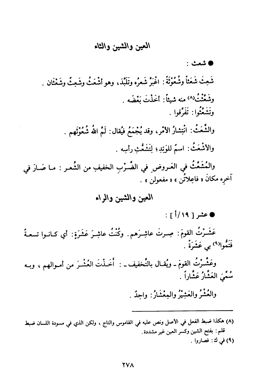 عشر عَشَرْتُ القومَ : صِرتَ عاشِرَهم . وكُنْتُ عاشِرَ عَشَرَةٍ : أي كانوا تسعةً فَتَمُّوا بي عَشَرَةً . وعَشرْتُ القومَ - ويُقال بالتخفيف - : أخَذْتَ العُشْرَ من أموالهم ، وبه سُميَ العَشارُ عَشاراً . والعُشْرُ والعَشِيْرُ والمِعْشَارُ : واحِدٌ .