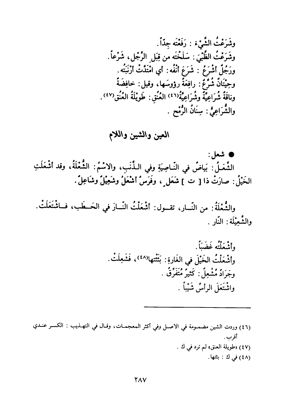شعل الشعلُ : بياضٌ في الناصِيَةِ وفي الذنَبِ ، والاسْمُ : الشُّعْلَةُ ، وقد أشْعَلَتِ الخَيْل : صارَتْ ذات ، شَعَل ، وفَرسٌ أشعَلُ وشَعيل وشَاعِلٌ . والشُّعْلَةُ : من النار ، تقول : أشْعَلْتُ النارَ في الحَطَب ، فاشْتَعَلَتْ . والشَّعِيْلَة : النار . وأشْعَلْتُه غَضَبَاً . وأشْعَلْتُ الخَيْلَ في الغَارةِ : بَثَثْتها ، فَشَعِلَتْ . وجَرَادٌ مُشْعِلٌ : كَثيرٌ مُتَفَرق . واشْتَعَلَ الرأسُ شَيْباً .