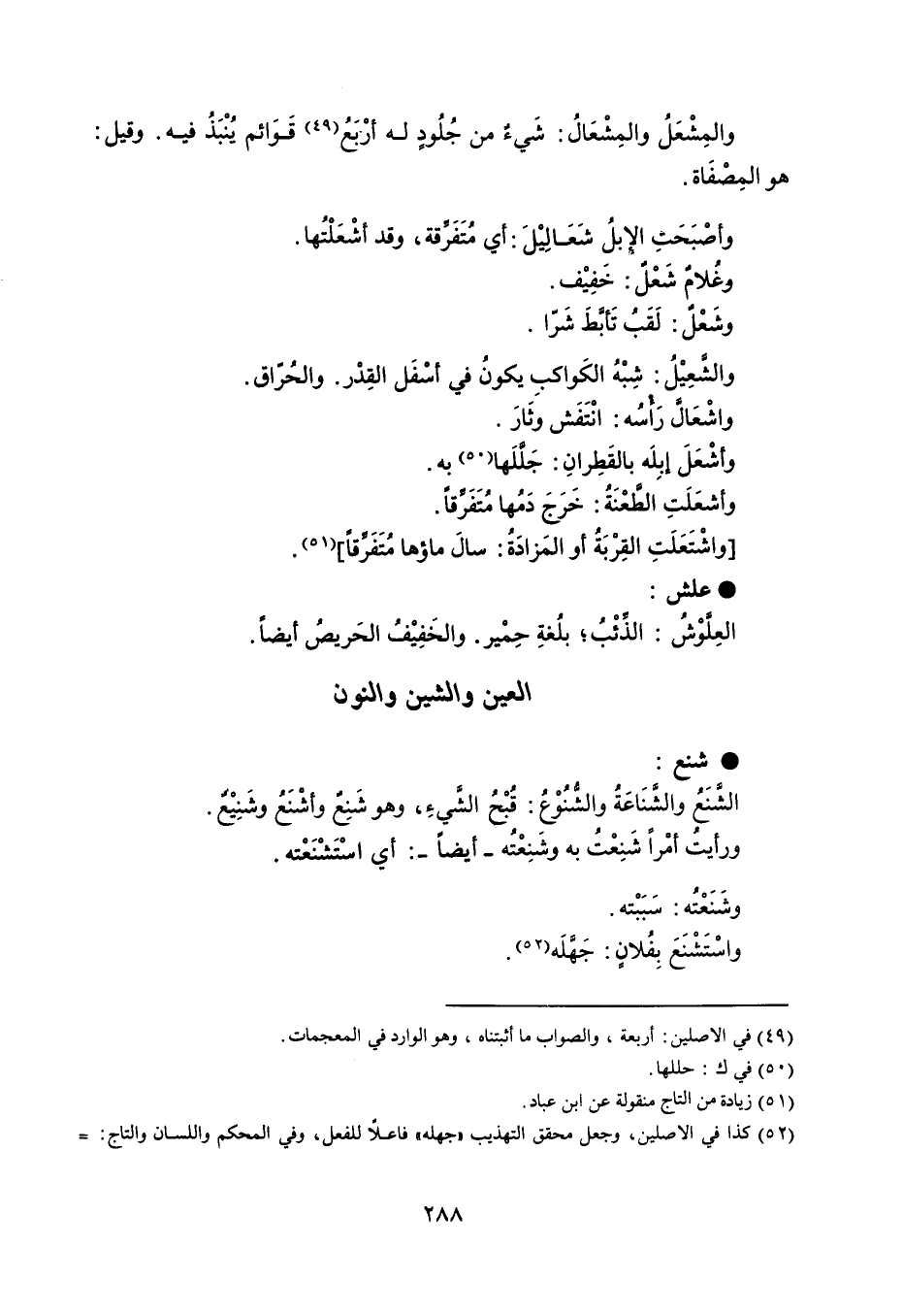 والمِشْعَلُ والمِشْعَالُ : شَيءٌ من جُلُودٍ له أرْبَعُ قَوَائم يُنْبذُ فيه . وقيل : هو المِصْفَاة . وأصْبَحَت الإبلشَعَالِيْلَ : أي مُتَفَرقة ، وقد أشْعَلْتُها . وغُلامٌ شَعْل : خَفِيْف . وشَعْلٌ : لَقَبُ تَأبطَ شَرّاً . والشعِيْل : شِبْهُ الكَواكبِ يكونُ في أسْفَل القدْر . والحراق . واشْعَال رَأسُه : انْتَفَش وثَارَ . وأشْعَلَ إبِلَه بالقَطِرانِ : جَللَها به . وأشعَلَتِ الطعْنَةُ : خَرَجَ دمُها مُتَفَرًقاً . أو اشْتَعَلت القِرْبَةُ أو المَزادَةُ : سالَ ماؤها مُتَفَرقاً . علش العِلوْشُ : الذئْبُ ؛ بلُغةِ حِمْير . والخَفيْفُ الحَريصُ أيضاً .