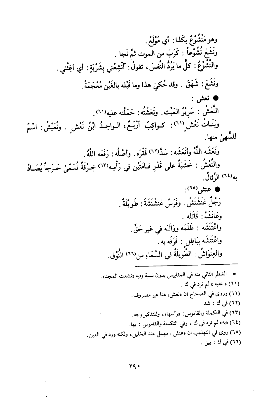 وهو مَنْشوع بكَذا : أي مُوْلَعٌ . ونَشَعَ نُشوْعاً : كَرَبَ من الموت ثم نَجا . والنشُوْعُ : كل ما يَرُد النفسَ ، تقولُ : أنْشِعْني بِشَرْبَةٍ : أي أغِثْني . ونَشَعَ : شَهَقَ . وقد حُكيَ هذا وما قَبْله بالغَيْن مُعْجَمَةً . نعش النعْشُ : سَرِيْرً المَيت . ونَعَشْته : حَمَلْته عليه . وبَنَاتُ نَعْش : كواكِبُ أرْبع ، الواحِدُ ابْن نَعْش . ونُعَيْشُ : اسْمٌ للسهى منها . ً ونَعَشَه اللهُ وأنْعَشَه : سَد فَقْرَه . وأصْلُه : رَفَعَه اللَّهُ . والنعْشُ : خَشَبَةٌ على قَدْرِ قامَتَيْن في رَأْسِه خِرْقَةٌ تُسمى حَرَجاً يُصَادُ به الرئالُ . عنش رَجُلٌ عَنَشنَشٌ . وفَرَسُ عَنَشْنَشَةٌ : طَويْلَةٌ . وعَانَشَهُ : قَاتَلَه . واعْتَنَشَه : ظَلَمَه ووَاثَبَه في غير حَقٍّ . واعْتَنَشَه بِبَاطِلٍ : قَرَفَه به . والعِنْوَاشُ : الطَّويلَةُ في السمَاءِ من النُّوْق .