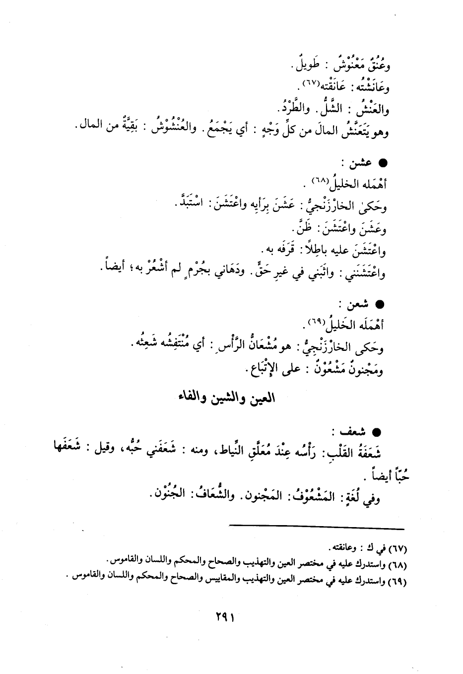وعُنُقٌ مَعْنُوْشٌ : طَويلٌ . وعَانَشْتُه : عَانَقْته . والعَنشُ : الشَلُّ . والطَّرْدُ . وهو يَتَعًنَشُ المالَ من كل وَجْهٍ : أي يَجْمَعُ . والعُنْشُوْشُ : بَقِيةٌ من المال . عشن أهْمَله الخليلُ . وحَكى الخارْزَنْجيُّ : عَشَنَ بِرَأيِه واعْتَشَنَ : اسْتَبَدَّ . وعَشَنَ واعْتَشَنَ : ظَنَّ . واعْتَشَنَ عليه باطِلاً : قَرَفَه به . واعْتَشَنَني : واثَبَني في غيرِ حَقٍّ . ودَهَاني بجُرْمٍ لم أشْعُرْ به ؛ أيضاً . شعن أهْمَلَه الخَليلُ . وحَكى الخارْزَنْجِيُ : هو مُشْعَانُ الرأْس : أي مُنْتَفِشُه شَعِثُه . ومَجْنونٌ مَشْعُوْنٌ : على الإتْبَاع .