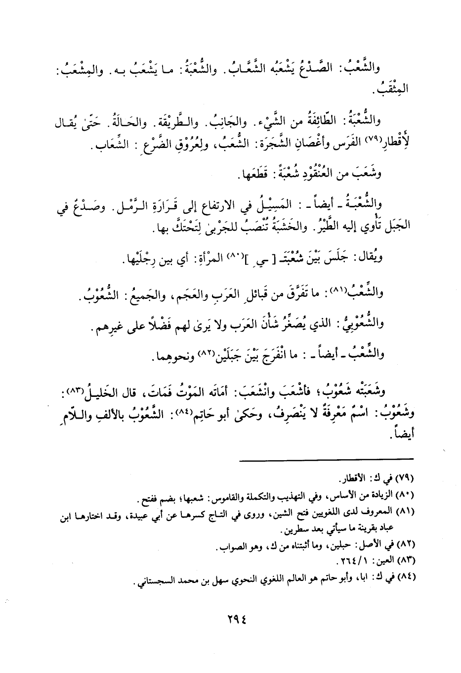 والشَعْبُ : الصَدْعُ يَشْعَبُه الشَعَّابُ . والشُّعْبَةُ : ما يَشْعَبُ به . والمِشْعَبُ : المِثْقَبُ . والشُعْبَةُ : الطّائِفَةُ من الشَّيْء . والجَانِبُ . والطَّريْقَة . والحَالَةُ . حَتّى يُقال لأقْطارِ الفَرَس وأغْصَانِ الشَّجَرَة : الشُعب ، ولِعُرُوْقِ الضَرْع : الشِّعَاب . وشَعَبَ من العًنْقُوْدِ شُعْبَةً : قَطَعَها . والشَعْبَة ُ - أيضاً - : المَسِيْلُ في الارتفاع إلى قَرَارَةِ الرَّمْل . وصَدْعٌ في الجَبَل تأوي إليه الطِّيْرُ . والخَشَبَةُ تُنْصَبُ للجَرْبى لِتَحْتَكً بها . ويُقال : جَلَسَ بَيْنَ شُعْبَتي المرْأةِ : أي بين رِجْلَيْها . والشَعْبُ : ما تَفَرقَ من قَبائل العَرَبِ والعَجَم ، والجَميعُ : الشُّعُوْبُ . والشُعُوْبِيُّ : الذي يُصَغِّرُ شأنَ العَرَب ولا يَرى لهم فَضْلاً على غيرِهم . والشَعْبُ - أيضاً - : ما انْفَرَجَ بَيْنَ جَبَلَيْن ونحوهِما . وشَعَبَتْه شَعُوْبُ ؛ فأشْعَبَ وانْشَعَبَ : أمَاتَه المَوْتُ فَمَاتَ . قال الخَليلُ : وشَعُوْبُ : اسْمٌ مَعْرِفَةٌ لا يَنْصَرِفُ ، وحَكى أبو حَاتِم : الشعًوْبُ بالألفِ واللام أيضاً .