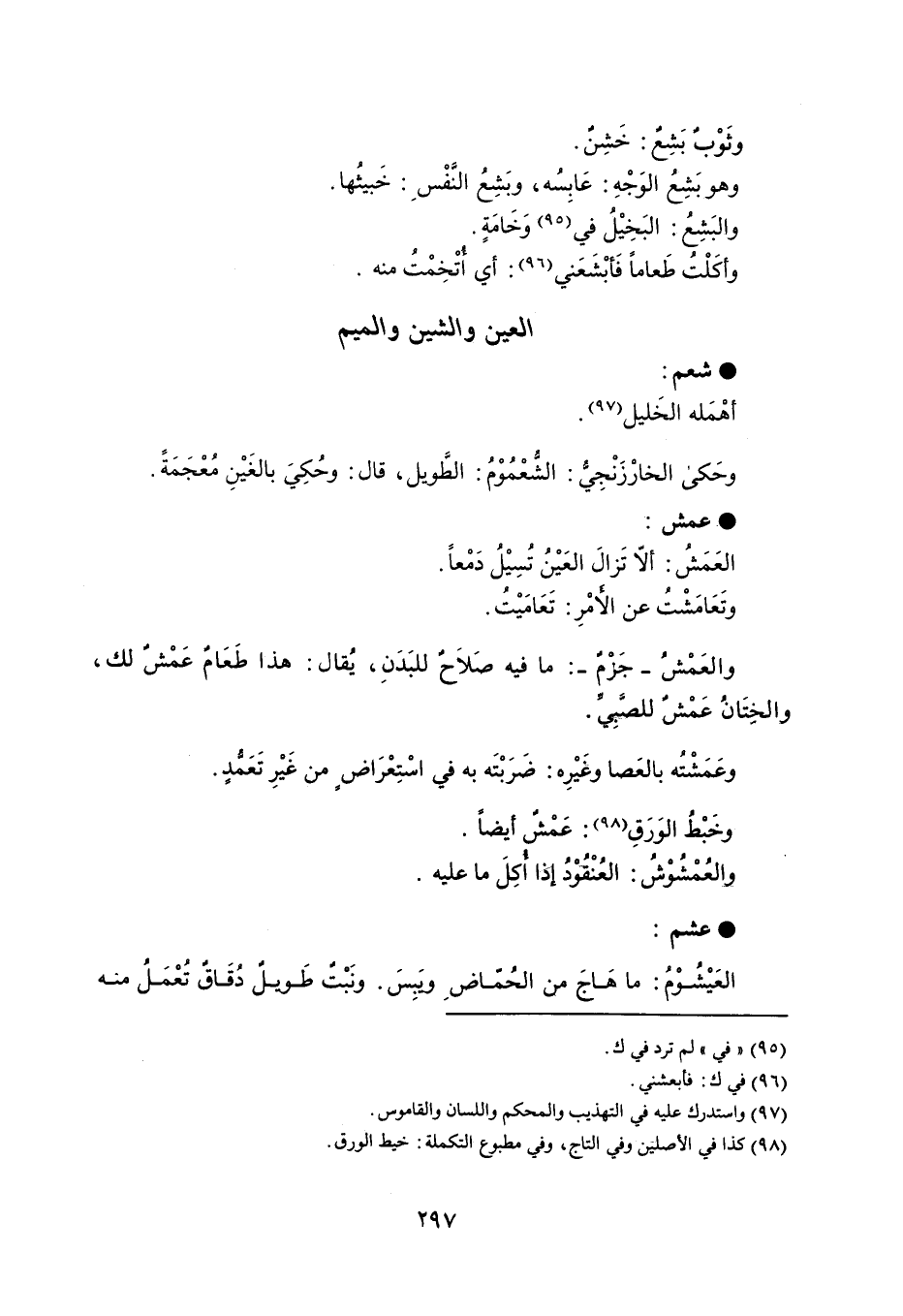 شعم أهْمَله الخَليل . وحَكى الخارْزَنْجِيُّ : الشُّعْمُوْمُ : الطَويل ، قال : وحُكِيَ بالغَيْنِ مُعْجَمَةً . عمش العَمَشُ : إلا تَزالَ العَيْنُ تُسِيْلُ دَمْعاً . وتَعَامَشْتُ عن الأمر : تَعَامَيْت . والعَمْشُ - جَزْمٌ - : ما فيه صَلاَحٌ للبَدَنِ ، يُقال : هذا طَعَامٌ عَمْش لك والخِتَانُ عَمْشٌ للصَبِي . وعَمَشْتُه بالعَصا وغَيْرِه : ضَرَبْتَه به في اسْتِعْرَاض من غَيْرِ تَعمُدٍ . وخَبْطُ الوَرَقِ : عَمْشٌ أيضاً . والعُمْشُوْشُ : العُنْقُوْدُ إذا أكِلَ ما عليه . عشم العَيْشُوْمُ : ما هَاجَ من الحُماض ويَبِسَ . ونَبْتٌ طَويلٌ دُقَاقٌ تُعْمَلُ منه