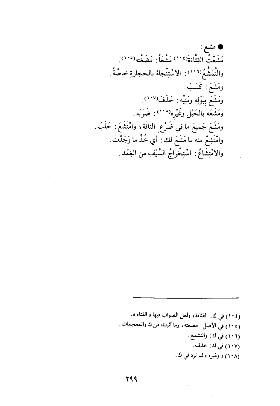 مشع مَشَعْتُ القثَّاءةَ مَشْعَاً : مَضَغْته . والتَّمَشُعُ : الاسْتِنْجَاءُ بالحجارةِ خاصَّةً . ومَشَعَ : كَسَبَ . . ومَشَعَ بِبَوْلي ومَنِيه : حَذَفَ . ومَشَعَه بالحَبْل وغَيْرِه : ضَرَبَه . ومَشَعَ جَميعَ ما في ضَرْع الناقَة ؛ وامْتَشَعَ : حَلَبَ . وامْتَشِعْ منه ما مَشَعَ لك : أي خُذْ ما وَجَدْتَ . والامْتِشَاعُ : اسْتِخْراجُ السيْفِ من الغِمْد .