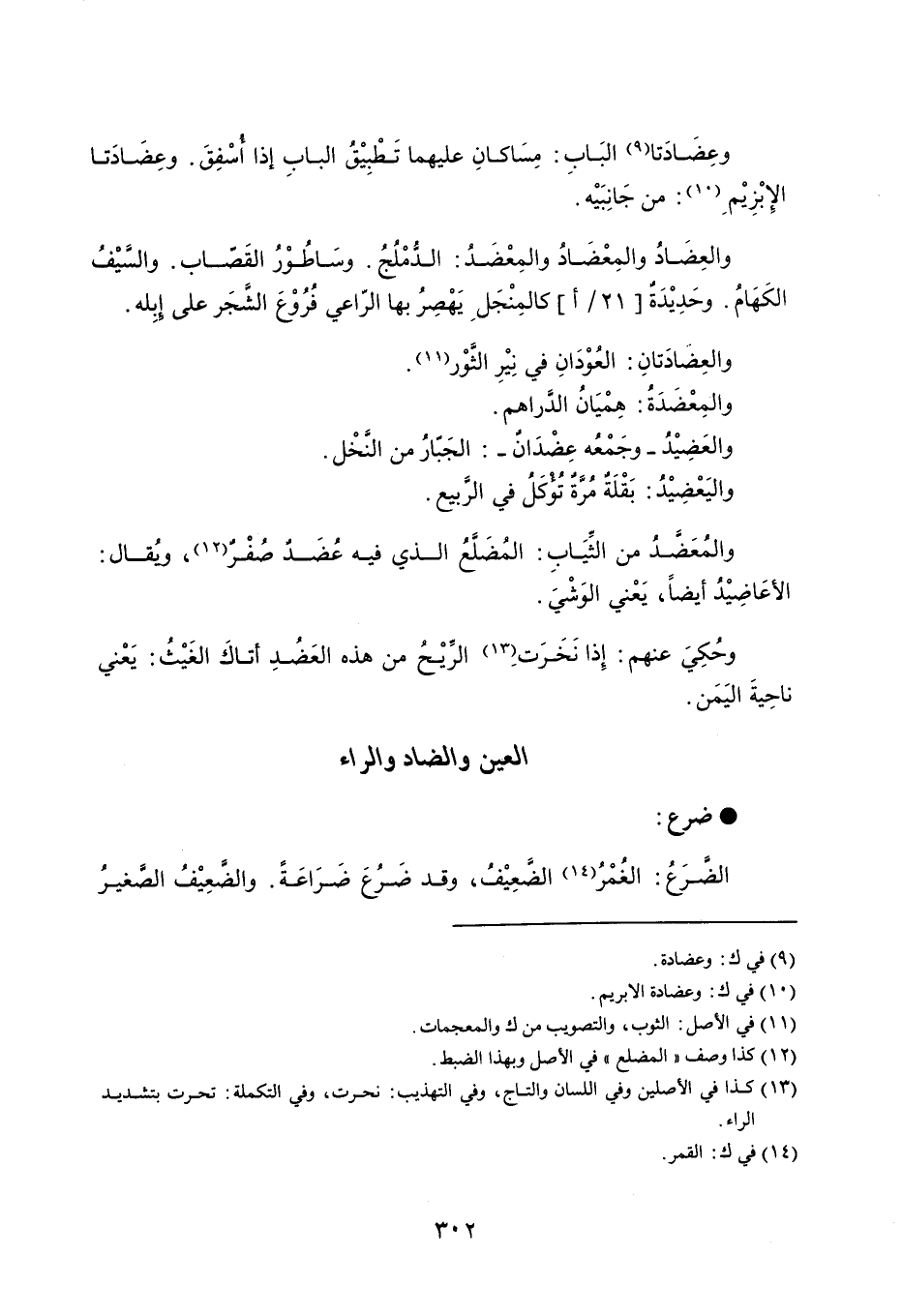 وعِضَادَتا البَابِ : مِسَاكانِ عليهما تَطْبِيْقُ البابِ إذا أسْفِقَ . وعِضَادَتا الإبْزِيْم : من جَانِبَيْه . والعِضَادُ والمِعْضَادُ والمِعْضَدُ : الدُّمْلُجُ . وسَاطُوْرُ القَصّاب . والسيْفُ الكَهَام . وحَدِيْدَةٌ كالمِنْجَل يَهْصِرُ بها الرّاعي فرُوْعَ الشَّجَر على إبِله . والعِضادَتانِ : العُوْدَانِ في نِيْرِ الثوْر . والمِعْضدَةُ : هِمْيَانُ الدَّراهم . والعَضِيْدُ - وجَمْعُه عِضْدَانٌ - : الجَبّارُ من النَّخْل . واليَعْضِيْد : بَقْلَة مُرًةٌ تُؤْكَلُ في الرَّبيع . والمُعَضَدُ من الثِّيَابِ : المُضَلعُ الذي فيه عُضَد صُفْر ، ويُقال : الأعَاضِيْدُ أيضاً ، يَعْني الوَشْيَ . وحُكِيَ عنهم : إِذا نَخَرَت الريْحُ من هذه العَضُدِ أتاكَ الغَيْث : يَعْني ناحِيةَ اليَمَن .
