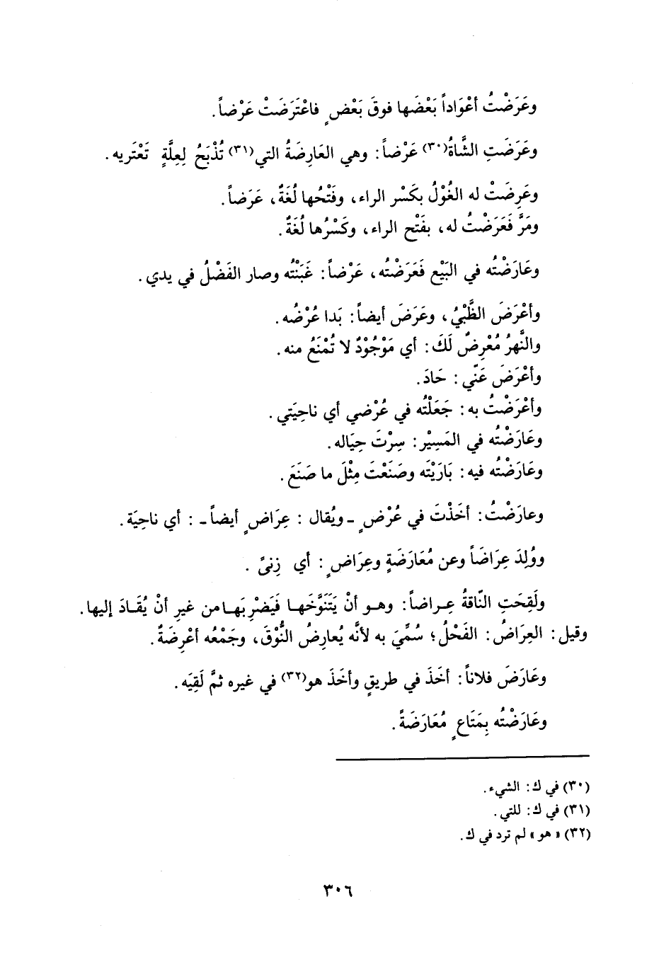 وعَرَضْتُ أعْوَاداً بَعْضَها فوقَ بَعْضٍ فاعْتَرَضَتْ عَرْضاً . وعَرَضَتِ الشًاةُ عَرْضاً : وهي العَارِضَةُ التي تُذْبَحُ لِعِلةٍ تَعْتَريه . وعَرِضَتْ له الغُوْلُ بكَسْر الراء ، وفَتْحُها لُغَةُ ، عَرَضاً . ومَرَّ فَعَرَضْتُ له ، بفَتْح الراء ، وكَسْرُها لُغَةٌ . وعَارَضْتُه في البَيْع فَعَرَضْتُه ، عَرْضاً : غَبَنْتُه وصار الفَضْلُ في يدي . وأعْرَضَ الظبْيُ ، وعَرَضَ أيضاً : بَدا عرْضُه . والنهرُ مُعْرِضٌ لَكَ : أي مَوْجُوْدٌ لا تُمْنَعُ منه . وأعْرَضَ عَني : حَادَ . وأعْرَضْت به : جَعَلْتُه في عُرْضي أي ناحِيَتي . وعَارَضْتُه في المَسِيْر : سِرْتَ حِيَاله . وعَارَضْتُه فيه : بَارَيْتَه وصَنَعْتَ مِثْلَ ما صَنَعَ . وعارَضْتُ : أخَذْتَ في عُرْض - ويُقال : عِرَاض أيضاً - : أي ناحِيَة . ووُلدَ عِرَاضَاً وعن مُعَارَضَةٍ وعِرَاض : أي زِنىً . ولقَحَتِ الناقةُ عِراضاً : وهو أنْ يَتَنوَخَها فَيَضْرِبَها من غيرِ أنْ يُقَاد إليها . وقيل : العِرَاضُ : الفَحْل ؛ سُميَ به لأنه يُعارِضُ النوْقَ ، وجَمْعُه أعْرِضَة . وعَارَضَ فلاناً : أخَذَ في طريقٍ وأخَذَ هو في غيره ثم لَقِيَه . وعَارَضْتُه بِمَتَاع مُعَارَضَةً .
