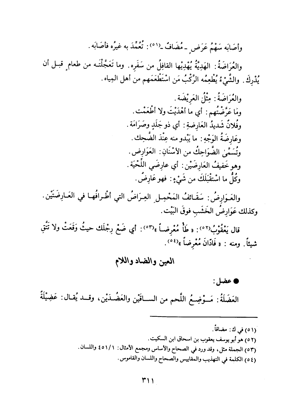 وأصَابَه سَهْمُ عَرَضٍ - مُضَاف - : تُعُمَدَ به غيرُه فأصَابَه . والعُرَاضَةُ : الهَدِيَّةُ يُهْدِيْها القافِلُ من سَفَرِه . وما تَعًجّلْتَه من طعامٍ قبل أن يُشْرِكَ . والشَيْءُ يُطْعِمُه الرَّكْبُ مَن اسْتَطْعَمَهم من أهل المِياه . والعُرَاضَةُ : مِثْلُ العَرِيْضًة . ومَا عَرضْتُهم : أي ما أهْدَيْتَ ولا أطْعَمْت . وفُلان شَديدُ العَارِضةِ : أي ذو جَلِدِ وصَرَامَة . وعَارِضَةُ الوَجْهِ : ما يَبدو منه عِنْدَ الضَّحِك . وتُسَمَّى الضَوَاحِكُ من الأسْنَانِ : العَوَارِض . وهو خَفيفُ العَارِضَيْن : أي عارِضَي اللِّحْيَة . وكُلُّ ما اسْتقْبَلَكَ من شَيْ : فهو عَارِضٌ . والعَوَارِضُ : سَقَائفُ المَحْمِل العِرَاضُ التي أطْرافُها في العَارِضَتَيْن . وكذلك عَوَارِضُ الخَشَبِ فوقَ البَيْت . قال يَعْقُوْبُ : ' طَأ مُعْرِضاً ' : أي ضَعْ رِجْلَك حيثُ وَقَعَتْ ولا تَتَقِ شيئاً . ومنه : ' فَادانَ مُعْرِضاً ' .