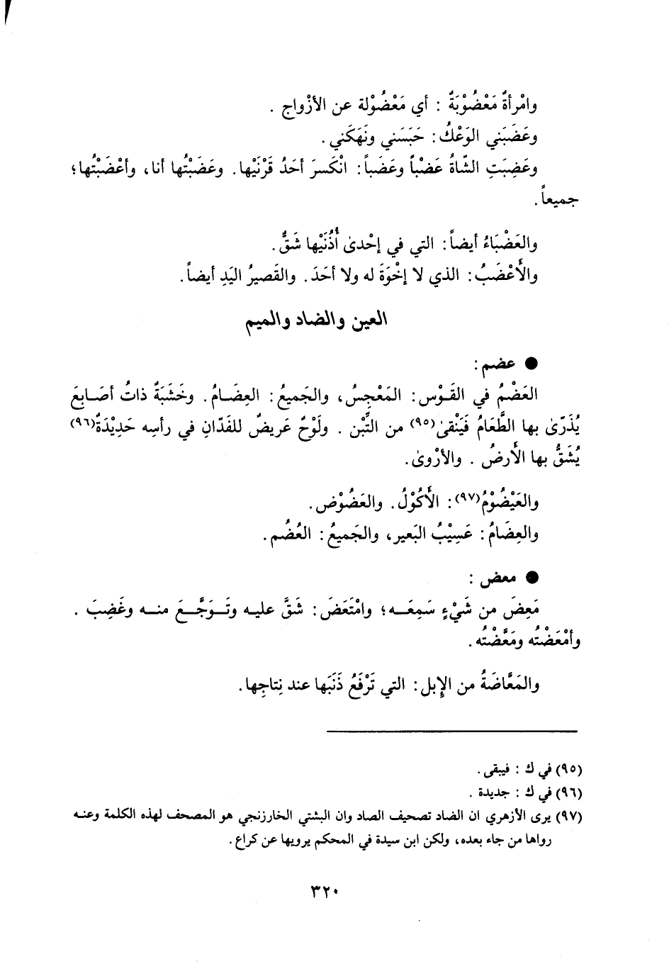 عضم العَضْمُ في القَوْس : المَعْجِسُ ، والجَميعُ : العِضَامُ . وخَشَبَةٌ ذاتُ أصَابعَ يذَرّى بها الطَّعَامُ فَيَنْقى من التِّبْن . ولَوْح عَريضٌ للفَدانِ في رأسِه حَدِيْدةٌ يُشَقُّ بها الأرضُ . والأرْوى . والعَيْضُوْم : الأكُوْلُ . والعَضُوْض . والعِضَامُ : عَسِيْبُ البَعير ، والجَميعُ : العُضُم . معض مَعِضَ من شَيْء سَمِعَه ؛ وامْتَعَضَ : شَقَّ عليه وتَوَجًعَ منه وغَضِبَ . وأمْعَضْتُه ومَعَّضْتُه . والمعَاضَةُ من الإبل : التي تَرْفَعُ ذَنَبَها عند نِتاجِها .