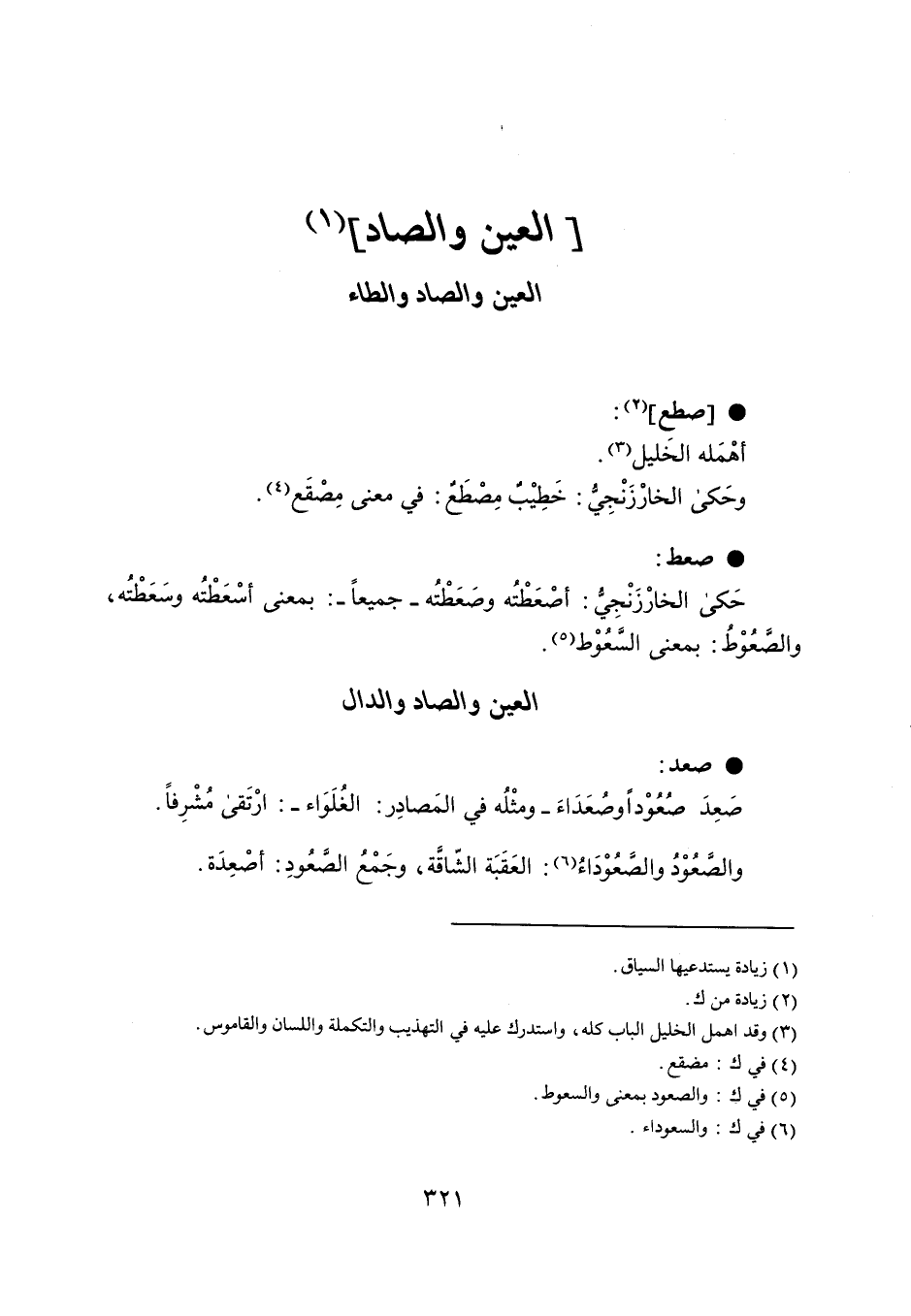 صطع أهْمَله الخَليل . وحَكى الخارْزَنْجِيُ : خَطِيْبٌ مِصْطَعٌ : في معنى مِصْقَع . صعط حَكى الخارْزَنْجِيُ : أصْعَطْتُه وصَعَطْتُه - جميعاً - : بمعنى أسْعَطْتُه وسَعَطْته والصَّعُوْطُ : بمعنى السَّعُوْط .