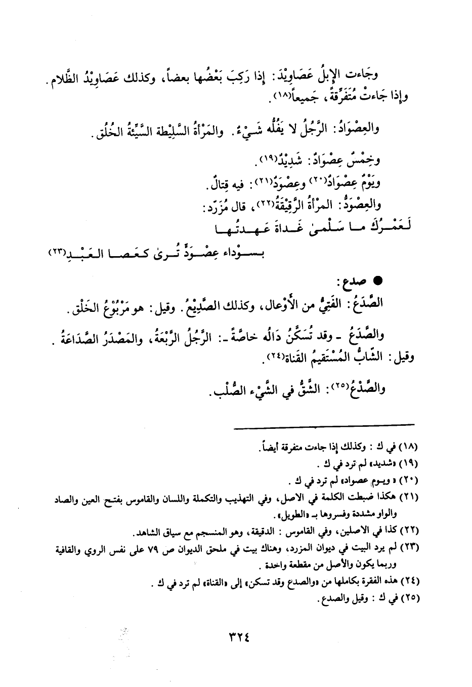 وجاءت الإبل عَصَا وِيْدَ : إذا رَكِبَ بَعْضُها بعضاً ، وكذلك عَصَاوِيْدُ الظَّلام . وإذا جَاءتْ مُتَفَرِّقةً ، جَميعاً . والعِصْوَادُ : الرَّجُلُ لا يَفُله شيء . والمَرْأةُ السلِيْطة السيئةُ الخُلُق . وخِمْسٌ عِصْوَادٌ : شَدِيْدٌ . ويَوْمٌ عِصْوَاد وعِصْوَدٌ : فيه قِتال . والعِصْوَدُ : المرْأةُ الرقِيْقَة ، قال مُزَرد : لعمْرُكَ ما سَلْمى غَداةَ عَهدتُها . . . بسوْداء عِصْوَد تُرى كعَصا العَبْدِ صدع الصدَع : الفتي من الأوْعال ، وكذلك الصديع . وقيل : هو مَرْبُوْعُ الخَلْق . والصدَع - وقد تُسَكنُ دَالُه خاصةً - : الرجُلُ الرَّبْعَةُ ، والمَصْدَرُ الصًدَاعَةُ . وقيل : الشّاب المُسْتَقيمُ القَناة . والصدْع : الشقُّ في الشيْء الصلْب .