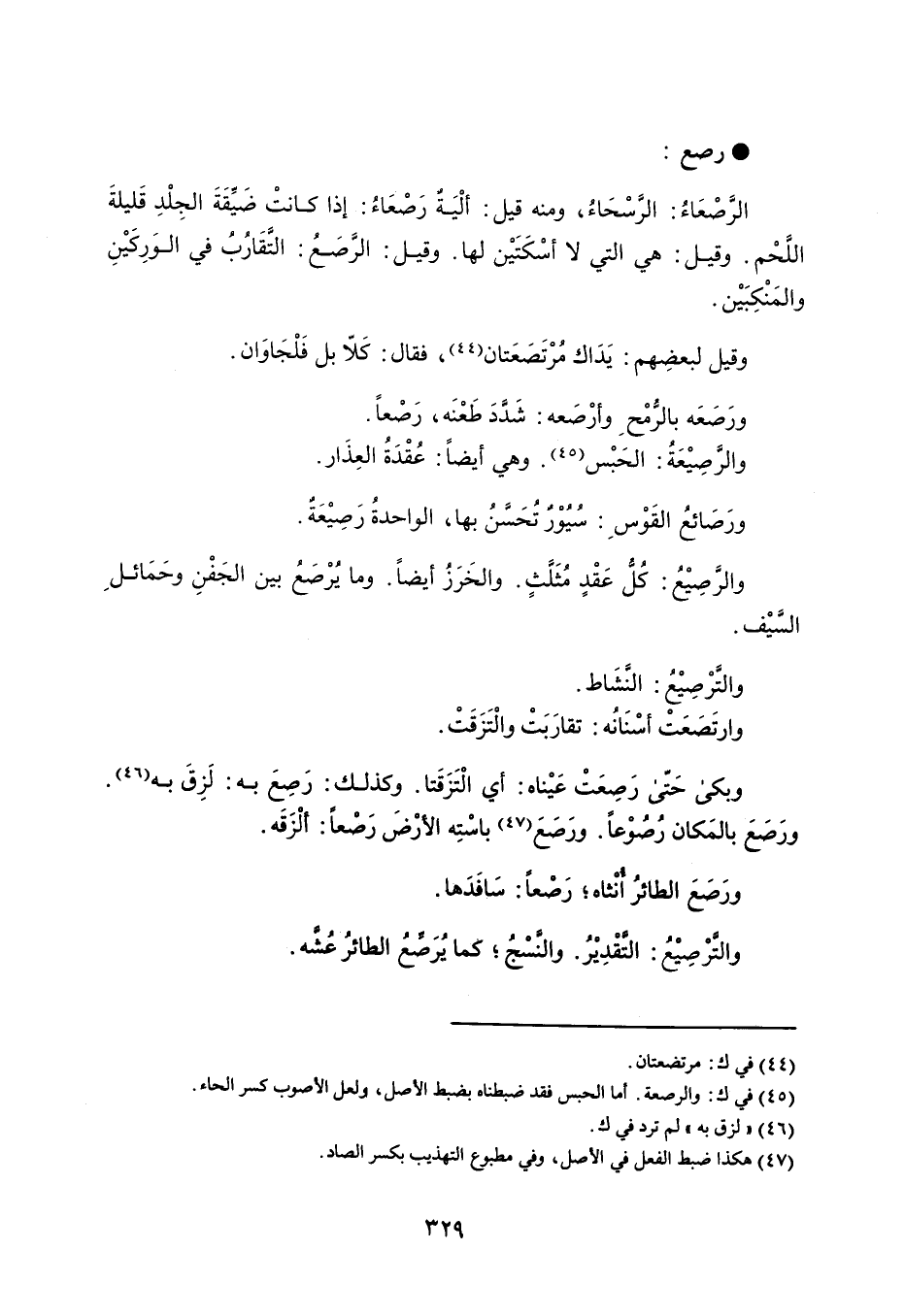 رصع الرصْعَاءُ : الرَّسْحَاءُ ، ومنه قيل : ألْيَةٌ رَصْعَاءُ : إذا كانتْ ضَيِّقَةَ الجِلْدِ قَليلةَ اللحم . وقيل : هي التي لا أسْكَتَيْن لها . وقيل : الرَّصَعُ : التَّقَارُبُ في الوَرِكَيْنِ والمَنْكِبَيْن . وقيل لبعضِهم : يَدَاك مُرْتَصَعَتان ، فقال : كَلا بل فَلْجَاوَان . ورَصَعَه بالرُّمْح وأرْصَعه : شَدَدَ طَعْنَه ، رَصْعاً . والرًصِيْعَةُ : الحَبْس . وهي أيضاً : عُقْدةُ العِذَار . ورَصَائعُ القَوْس : سُيُوْرٌ تُحَسنُ بها ، الواحدةُ رَصِيْعَةٌ . والرَّصِيْعُ : كُلُّ عَقْدٍ مثلثٍ . والخَرَزُ أيضاً . وما يُرْصَعُ بين الجَفْنِ وحَمَائل السيف . والترْصِيْعُ : النَّشَاط . وارتَصَعَتْ أسْنَانُه : تقارَبَتْ والْتَزَقَتْ . وبكى حَتى رَصِعَتْ عَيْناه : أي الْتَزَقَتا . وكذلك : رَصِعَ به : لَزِقَ به . ورصعَ بالمَكان رُصُوْعاً . ورَصَعَ باسْتِه الأرْضَ رَصْعاً : ألْزَقَه . ورَصَعَ الطائرُ أنْثاه ، رَصْعاً : سَافَدَها . والترصِيْعُ : التقْدِيْرُ . والنسْجُ ؟ كما يُرصعُ الطائرُ عُشه .
