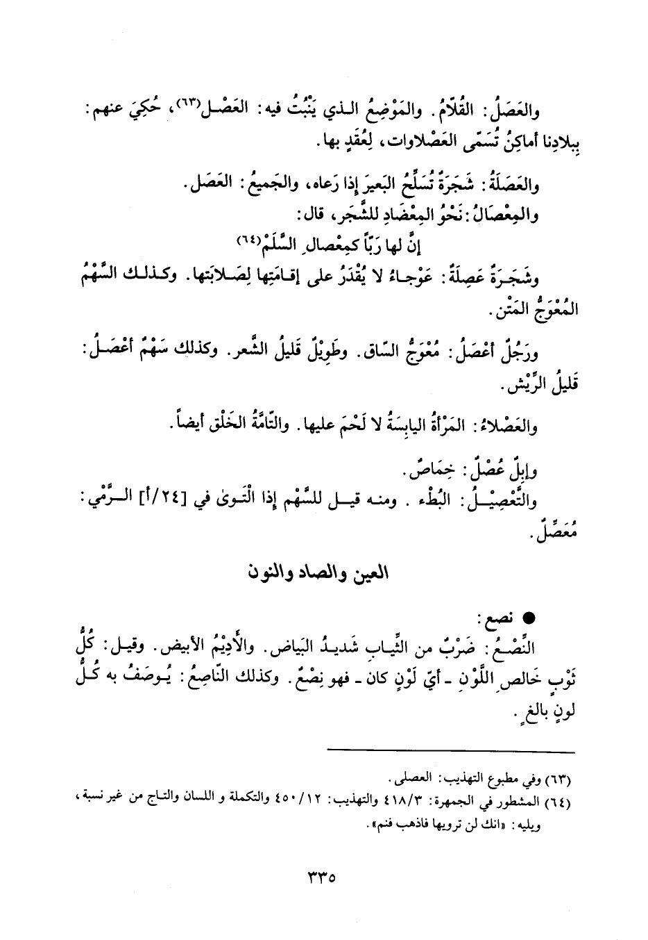 والعَصَلُ : القُلامُ . والمَوْضِعُ الذي يَنْبُتُ فيه : العصل ، حُكِيَ عنهم : بِبلادِنا أماكِنُ تُسَمى العَصْلاوات ، لِعقَدٍ بها . والعَصَلَةُ : شَجَرَةٌ تُسلحُ البَعيرَ إذا رَعاه ، والجميع : العَصَل . والمِعْصَالُ : تحْوُ المِعْضَادِ للشجَر ، قال : إن لها رباً كمِعْصال السلم وشَجَرَةٌ عَصِلَة : عَوْجاءُ لا يًقْدَرُ على إقامتها لصَلابَتها . وكذلك السهْمُ المُعْوَجُّ المَتْن . ورَجُلٌ أعْصَلُ : مُعْوَجُّ الساق . وطَوِيْلٌ قليل الشعر . وكذلك سَهْمٌ أعْصَلُ : قَليلُ الريْش . والعَصْلاءُ : المَرْأةُ اليابِسَةُ لا لَحْمَ عليها . والتامَة الخَلْق أيضاً . وإبِل عُصْلٌ : خِمَاص . والتًعْصِيْلُ : البُطْء . ومنه قيل للسهْم إذا التَوى في الرَّمْي : مُعصَلٌ .