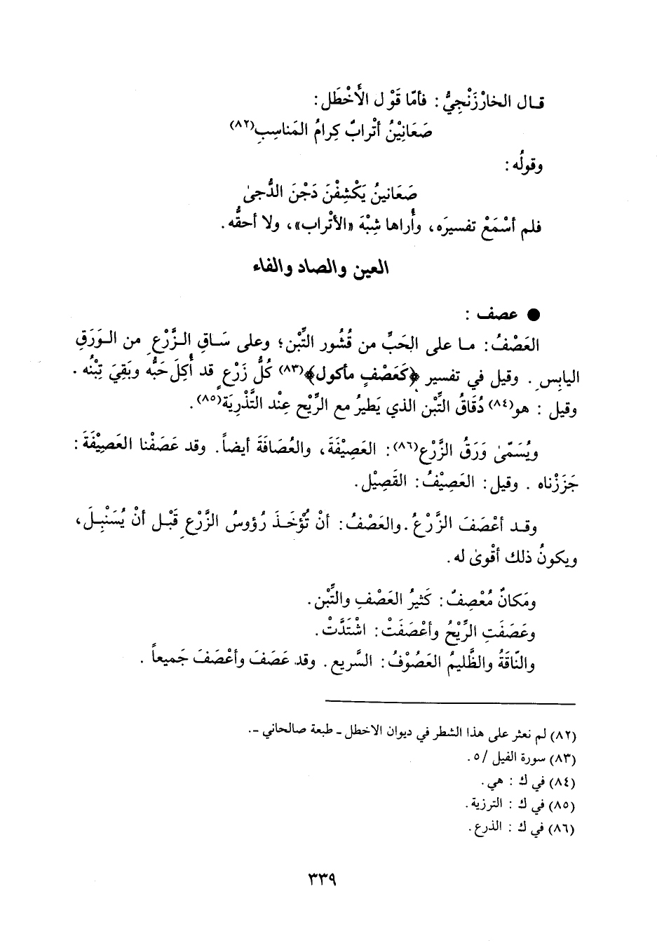 عصف العَصْفُ : ما على الحَب من قُشُور التبْن ؛ وعلى سَاقِ الزرْع من الوَرَقِ اليابِس . وقيل في تفسير ' كَعَصْفٍ مأكول ' كُل زَرْع قد أكِلَ حبه وبَقِيَ تِبْنُه . وقيل : هو دُقَاقُ التَبْن الذي يَطيرُ مع الريْح عِنْد التَذْرِيَة . وُيسَمّى وَرَق الزَّرْع : العصِيْفَةَ ، والعُصَافَةَ أيضاً . وقد عَصَفْنا العَصِيْفَةَ : جَزَزْناه . وقيل : العَصِيْفُ : القَصِيْل . وقد أعْصَفَ الزًرْعُ . والعَصْفُ : أنْ تؤخَذَ رُؤوسُ الزَرْع قَبْل أنْ يسَنْبِلَ ، ويكونُ ذلك أقْوى له . ومَكانٌ مُعْصِفٌ : كَثيرُ العَصْفِ والتِّبْن . وعَصَفَتِ الرِّيْح وأعْصَفَتْ : اشْتَدَتْ . والنّاقَةُ والظَّليمُ العَصُوْف : السًريع . وقد عَصَفَ وأعْصَفَ جَميعاً .