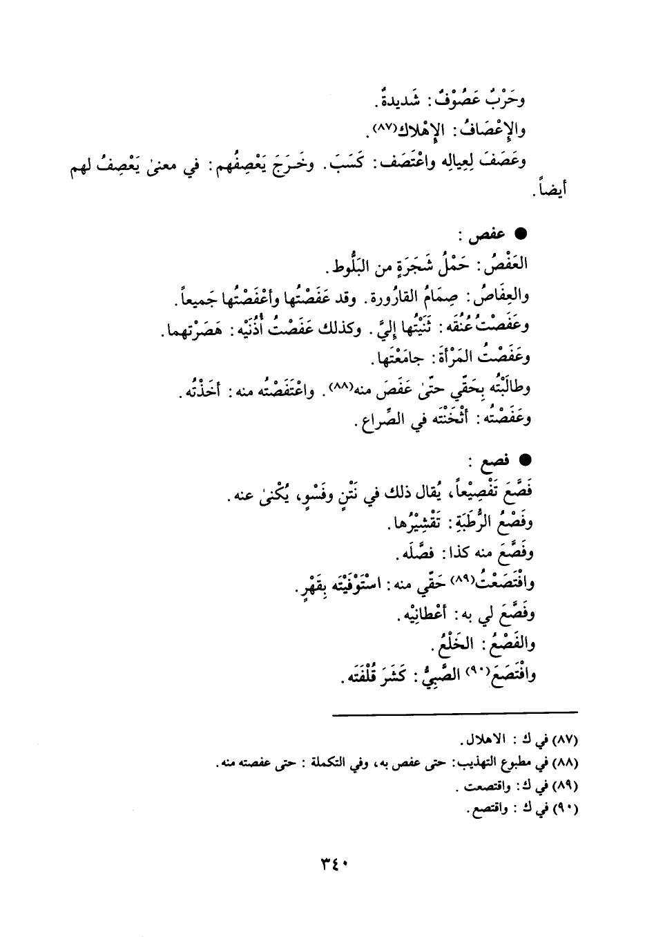 وحَرْبٌ عَصُوْفٌ : شَديدةٌ . والعْصَافُ : الهْلاك . وعَصَفَ لِعِيالِه واعْتَصَف : كَسَبَ . وخَرَجَ يَعْصِفُهم : في معنى يَعْصِفُ لهم عفص العَفْصُ : حَمْلُ شَجَرَةٍ من البَلُّوط . والعِفَاصُ : صِمَامُ القارُورة . وقد عَفَصْتُها وأعْفَصْتُها جَميعاً . وعَفَصْتُ عُنُقَه : ثَنَيْتُها إِليَّ . وكذلك عَفَصْتُ اذُنَيْه : هَصَرْتهما . وعَفَصْتُ المَرْأةَ : جامَعْتَها . وطالَبْتُه بِحَقّي حتى عَفَصَ منه . واعْتَفَصْتُه منه : أخَذْتُه . وعَفَصْته : أثْخَنْتَه في الصِّراع . فصع فَضعَ تَفْصِيْعاً ، يُقال ذلك في نَتْنٍ وفَسْوٍ ، يُكْنى عنه . وفَصْعُ الرطَبَةِ : تَقْشِيْرها . وفصعَ منه كذا : فَصّلَه . وافْتَصَعْتُ حَقي منه : اسْتَوْفَيْتَه بِقَهْرٍ . وفَصعَ لي به : أعْطانِيْه . والفَصع : الخَلْعُ . وافْتَصَعَ الصبِيُّ : كَشَرَ قُلْفَتَه .