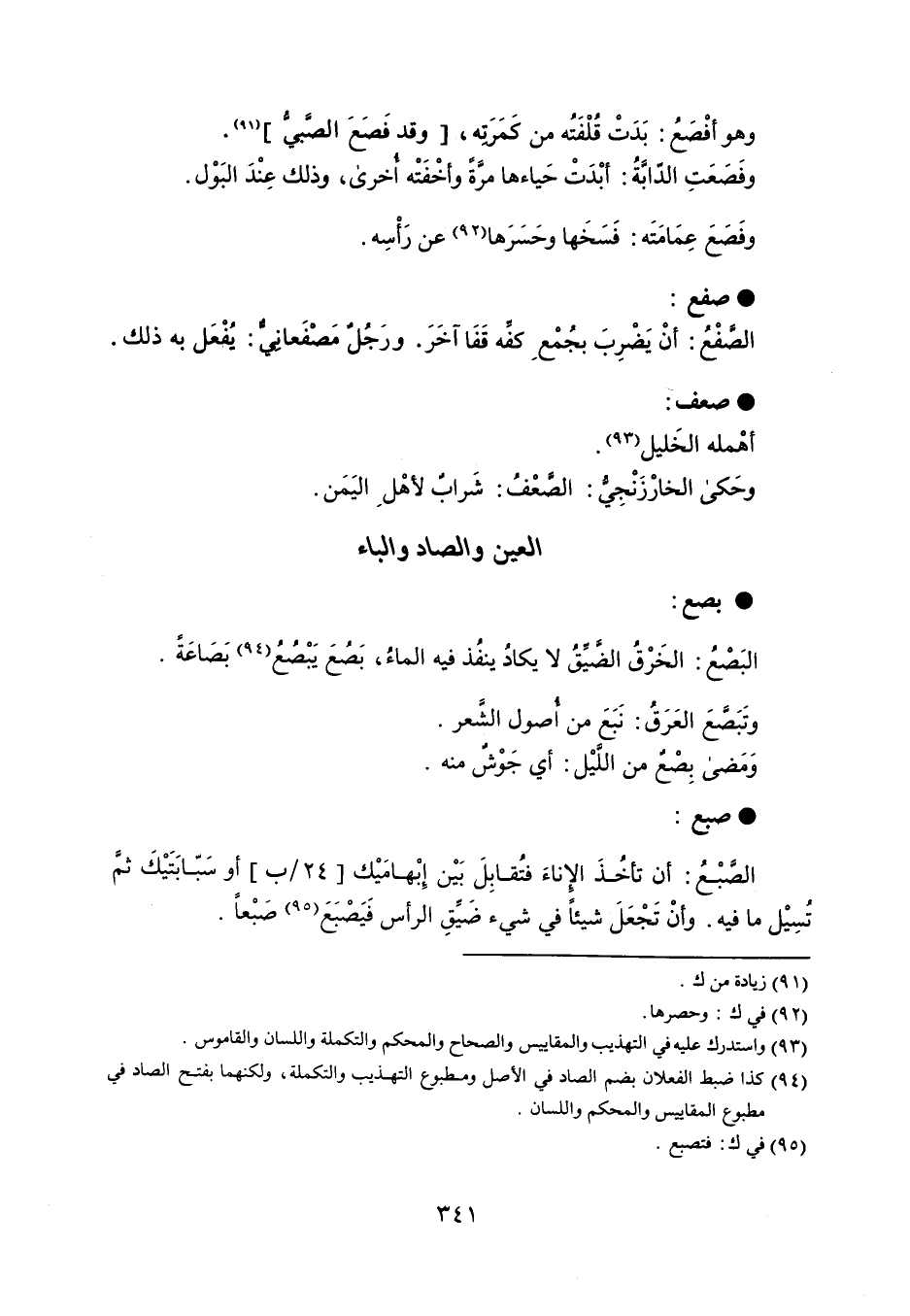 بصع البَصْعُ : الخَرْقُ الضَيق لا يكادُ ينفُذ فيه الماءُ ، بَصُعَ يَبْصُعُ بَصَاعَةً . وتَبصَعَ العَرَقُ : نَبَعَ من أصول الشَعر . وَمَضى بِصْعٌ من اللَّيْل : أي جَوش منه . صبع الصَّبْعُ : أن تأخُذَ الإناءَ فتُقابِلَ بَيْن إِبْهامَيْك ، أو سبابَتَيْكَ ثمً تُسِيْل ما فيه . وأنْ تَجْعَلَ شيئاً في شيء ضَيق الرأس فَيَصْبَعَ صَبْعاً .