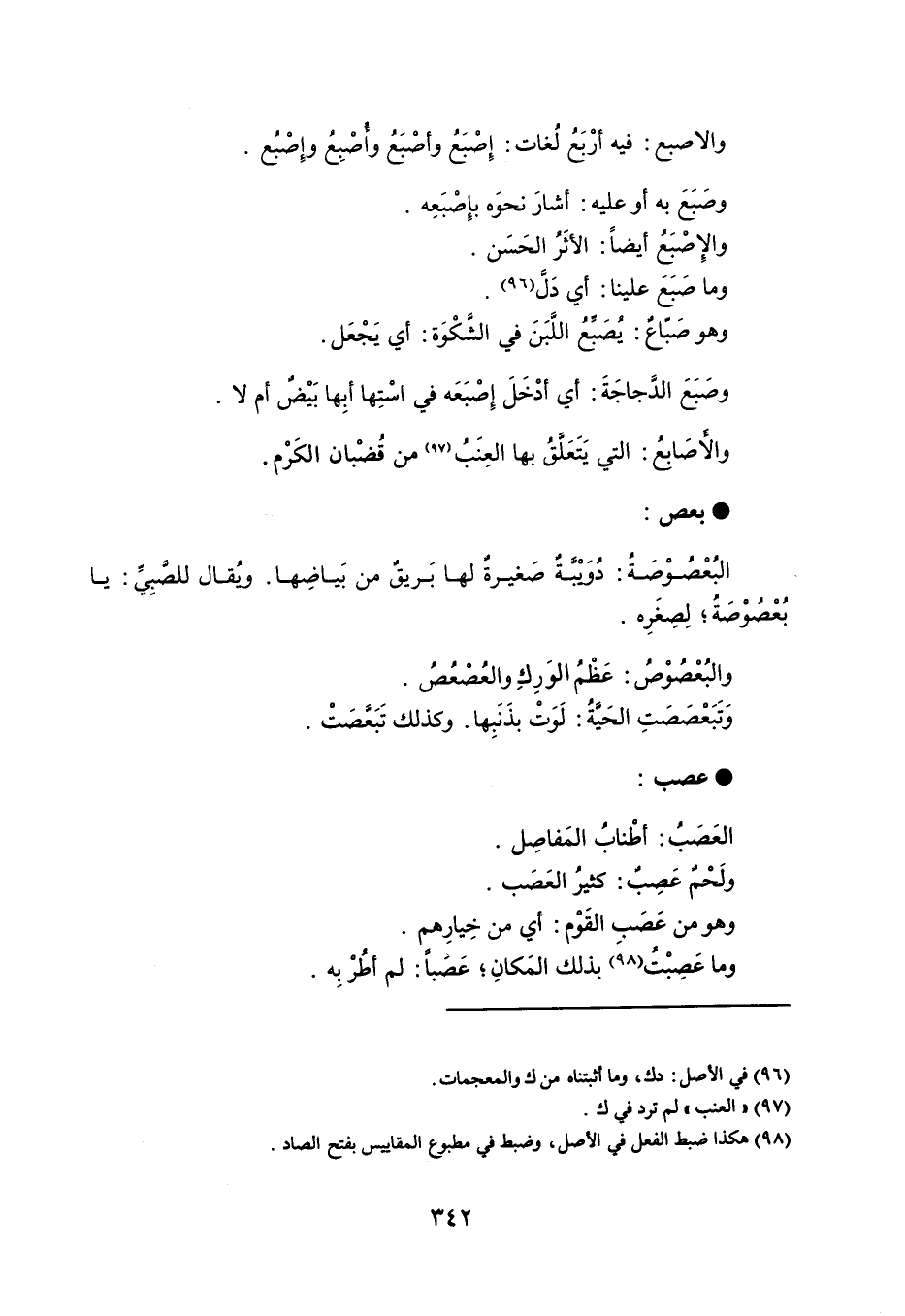 والاصبع : فيه أرْبَعُ لُغات : إِصْبَعُ وأصْبَعُ واصْبِعُ وإِصْبُع . وصَبَعَ به أو عليه : أشارَ نحوَه بإِصْبَعِه . والإصْبَعُ أيضاً : الأثَرُ الحَسَن . وما صَبَعَ علينا : أي دلَ . وهو صَبّاعٌ : يُصَبِّعُ اللَّبَنَ في الشَّكْوَة : أي يَجْعَل . وصَبَعَ الدَجاجَةَ : أي أدْخَلَ إِصْبَعَه في اسْتِها أبِها بَيْضٌ أم لا . والأصَابعُ : التي يَتَعَلَّقُ بها العِنَبُ من قُضْبان الكَرْم . بعص البُعْصُوْصَةُ : دُوَيبةٌ صَغيرة لها بَريق من بَياضِها . ويُقال للصَّبِيِّ : يا بُعْصُوْصَةُ ؛ لِصِغَرِه . والبُعْصُوْصُ : عَظْمُ الوَرِكِ والعُصْعُصُ . وَتَبَعْصَصَتِ الحَيًةُ : لَوَتْ بذَنَبِها . وكذلك تَبَعَّصَتْ . عصب العَصَبُ : أطْنابُ المَفاصِل . ولَحْمٌ عَصب : كثيرُ العَصَب . وهو من عَصَبِ القَوْم : أي من خِيارِهم . وما عَصِبْتُ بذلك المَكانِ ؛ عَصَباً : لم أطُرْ بِه .