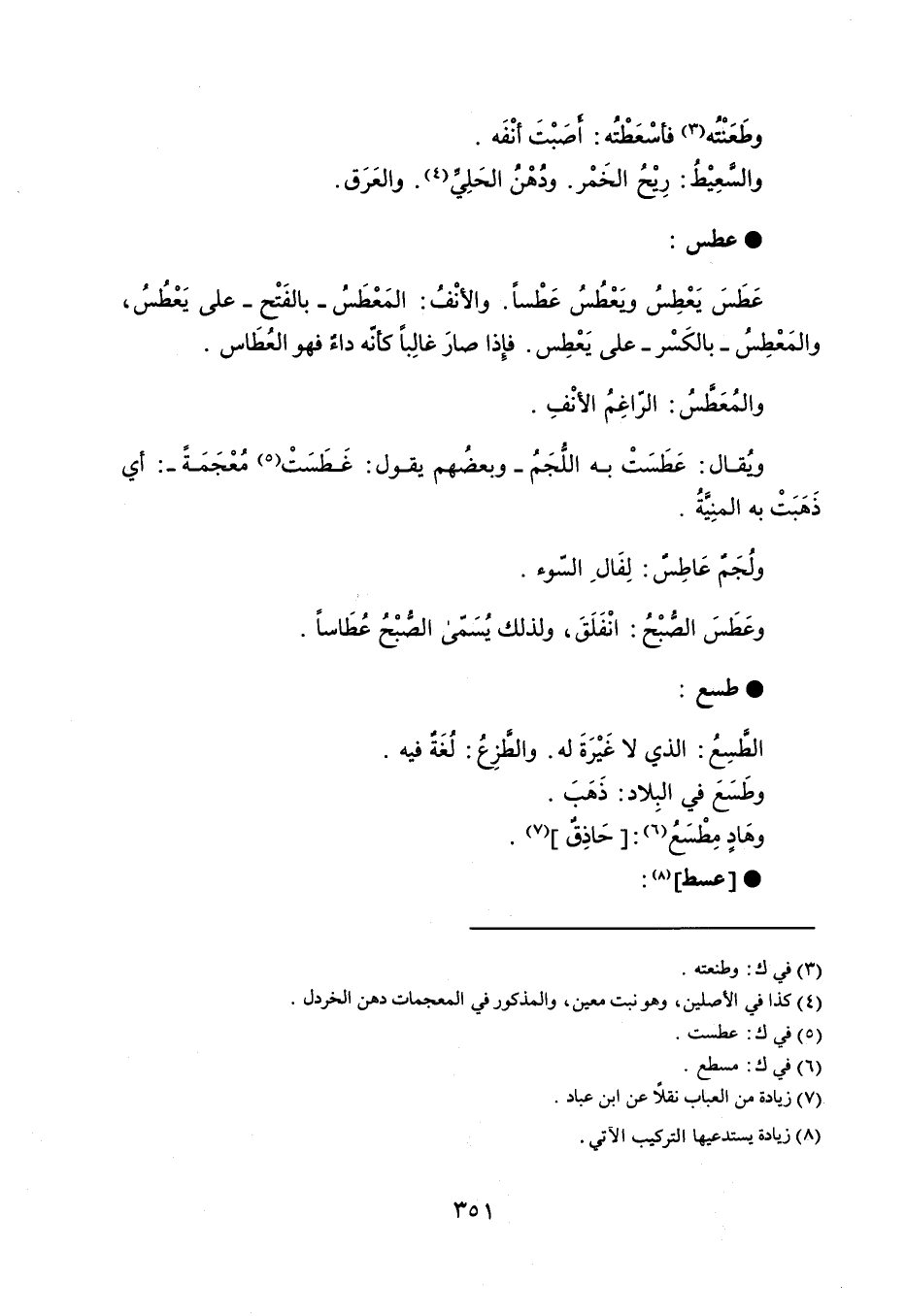 وطَعَنْتُه فأسْعَطْته : أصَبْتَ أنْفَه . والسعِيْطُ : رِيْحُ الخَمْر . ودُهْنُ الحَلِي والعرق . عطس عَطَسَ يَعْطِسُ ويَعْطُسُ عَطْساً . والأنْفُ : المَعْطَسُ - بالفَتْح - على يَعْطُسُ ، والمَعْطِسُ - بالكَسْر - على يَعْطِس . فإذا صارَ غالِباً كأنه داد فهو العُطَاس . والمُعَطسُ : الراغِمُ الأنْفِ . ويُقال : عَطَسَتْ به اللُّجَمُ - وبعضُهم يقول : غَطَسَتْ مُعْجَمَةً - : أي ذَهَبَتْ به المنيةُ . ولُجَمٌ عَاطِسٌ : لِفَال السّوء . وعَطَسَ الصُّبْحُ : انْفَلَقَ ، ولذلك يُسَمّى الصُبْحُ عُطَاساً . طسع الطسِعُ : الذي لا غَيْرَةَ له . والطزِعُ : لُغَة فيه . وطَسَعَ في البِلاد : ذَهَبَ . وهَادٍ مِطْسَعُ : حَاذِق . عسط