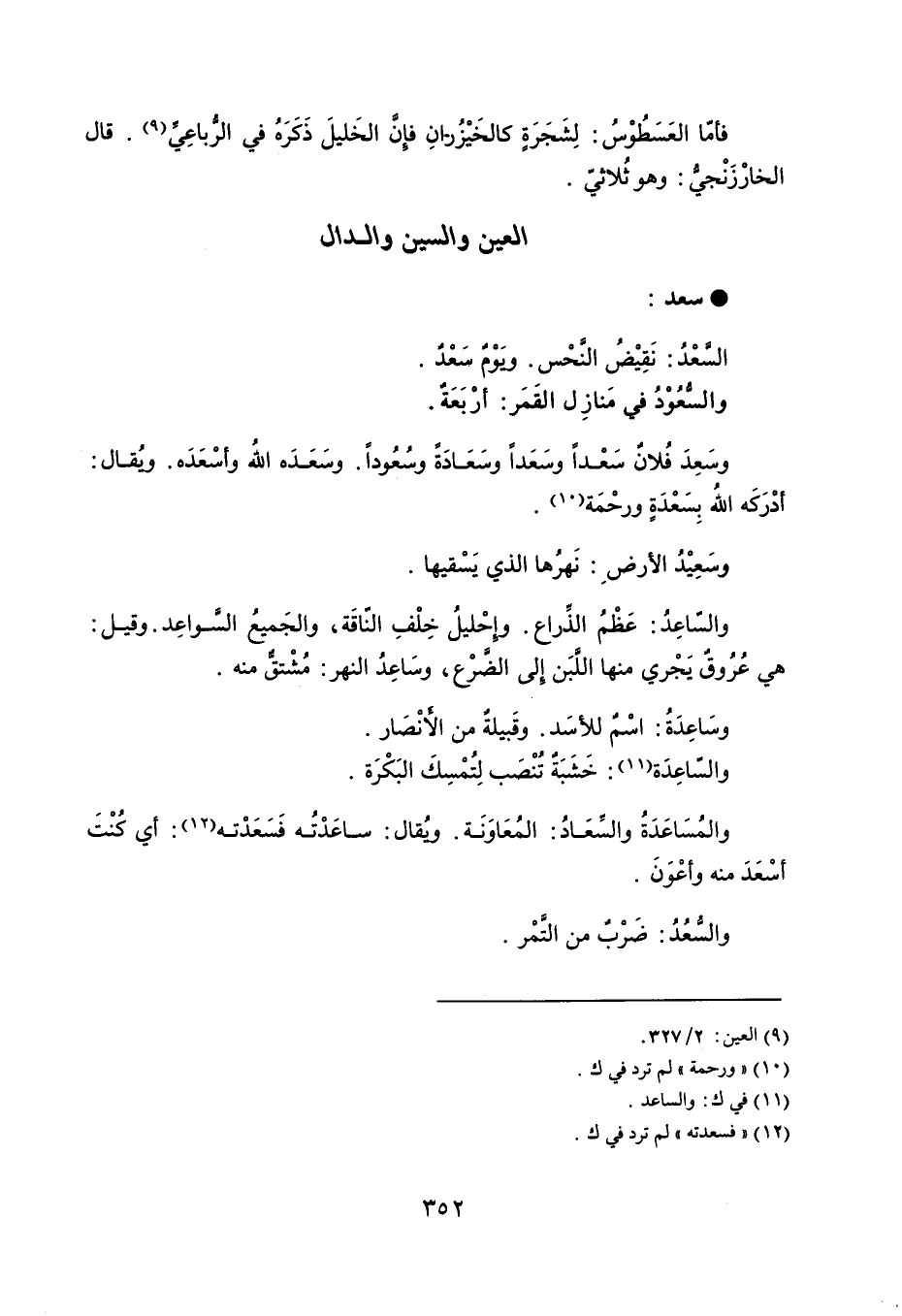 سعد السعْدُ : نَقِيْضُ النحْس . ويَوْمٌ سَعْد . والسعوْدُ في مَنازِل القَمَر : أرْبَعَةٌ . وسَعِدَ فُلانٌ سَعْداً وسَعَداً وسَعَادَةً وسُعُوداً . وسعَده اللُه وأسْعدَه . ويُقال : أدْرَكَه اللُه بِسَعدَةٍ ورحْمَة وسَعِيْدُ الأرض : نَهرُها الذي يَسْقيها . والسّاعِدُ : عَظْمُ الذَراع . وإحْليلُ خِلْفِ الناقَة ، والجَميعُ السواعِد . وقيل : هي عُرُوقٌ يَجْري منها اللَّبَن إلى الضَرْع ، وسَاعِدُ النهر : مشْتق منه . وسَاعِدَةُ : اسْمٌ للأسَد . وقَبيلةٌ من الأنْصَار . والسّاعِدَة : خَشَبَةٌ تُنْصَب لِتُمْسِكَ البَكْرَة . والمُسَاعَدَةُ والسِّعَادُ : المُعَاوَنَة . ويُقال : ساعَدْتُه فَسَعَدْته : أي كُنْتَ أسْعَدَ منه وأعْوَنَ . والسعُدُ : ضَرْبٌ من التَمْر .