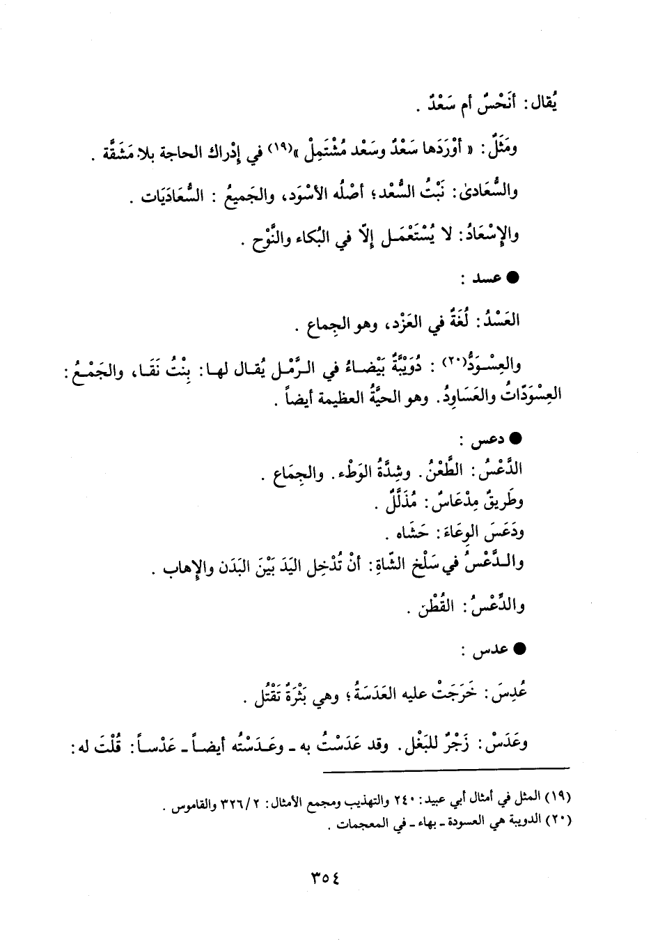 يُقال : أنَحْس أم سعْدٌ . ومَثَلٌ : ' أوْرَدَها سَعد وسَعْد مُشْتَمِلْ ' في إدراك الحاجة بلا مَشَقَّة . والسُّعَادى : نَبت السعْد ؛ أصْلُه الأسْوَد ، والجَميعُ : السعَادَيَات . والإسْعَادُ : لا يُسْتَعْمَل إلا في البُكاء والنَّوْح . عسد العَسْدُ : لُغَة في العَزْد ، وهو الجِماع . والعِسْوَد : دُوَيبةٌ بَيْضاءُ في الرمْل يُقال لها : بِنْتُ نَقَا ، والجَمْعُ : العِسْوَدّاتُ والعَسَاوِدُ . وهو الحيةُ العظيمة أيضاً . دعس الدعْسُ : الطعْنُ . وشدةُ الوَطْء . والجِمَاع . وطَريقٌ مِدْعَاسٌ : مُذَلَلٌ . ودَعَسَ الوِعَاءَ : حَشَاه . والدعْسُ في سَلْخ الشّاةِ : أنْ تُدْخِل اليَدَ بَيْنَ البَدَن والإهاب . والدعْس : القُطْن . عدس عُدِسَ : خَرَجَتْ عليه العَدَسَةُ ؛ وهي بَثْرَة تَقْتُل . وعَدَسْ : زَجر للبَغْل . وقد عَدسْتُ به - وعَدَسْتُه أيضاً - عَدْساً : قُلْتَ له :