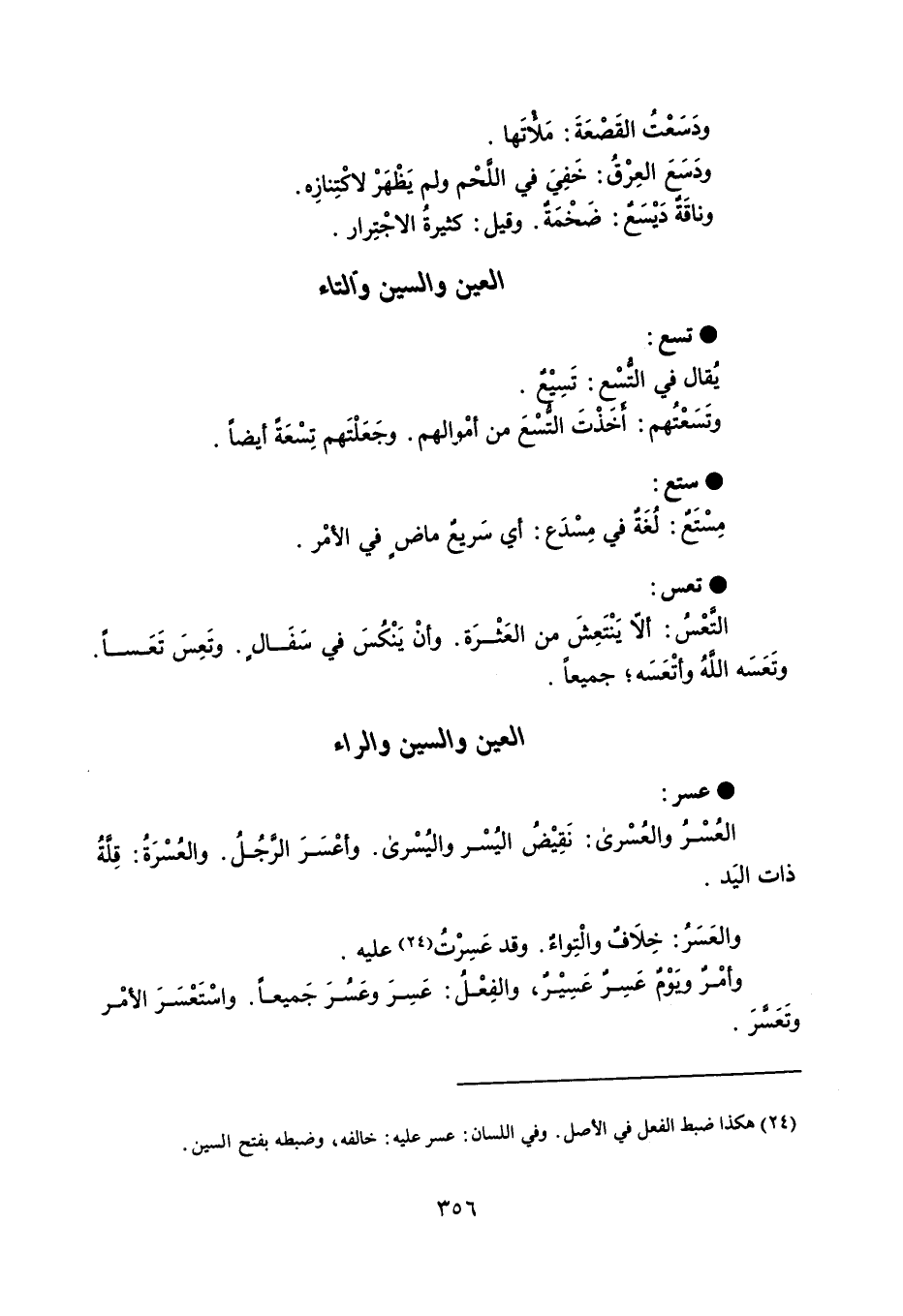 تسع يُقال في التُّسْع : تسِيْعٌ . وتَسَعْتهم : اخَذْتَ التسْعَ من أموالهم . وجَعَلْتَهم تسْعَةً أيضاً . ستع مِسْتع : لُغةٌ في مِسْدَع : أي سَريعٌ ماض في الأمْر . تعس التعْسُ : ألا ينْتَعِشَ من العَثْرَة . وأنْ ينْكًسَ في سَفَال . وتَعِسَ تَعساً . وتَعَسَه اللهُ وأتْعَسَه ؛ جميعاً .