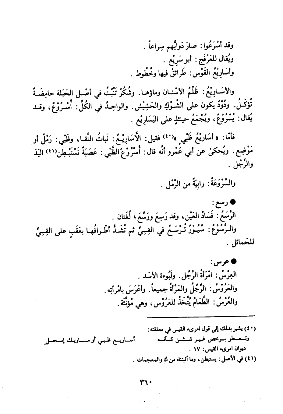 وقد أسْرَعُوا : صار دوابهم سِراعاً . ويُقال للعَرْفَج : أبو سَرِيْع . وأسَارِيْعُ القَوْس : طَرائقُ فيها وخُطُوط . والأسَارِيْعُ : ظَلْمُ الأسْنان وماؤها . وشُكُرٌ تَنْبُتُ في أصْل الحَبَلة حامِضَةٌ تُؤكَلُ . ودُوْد يكون على الشوْكِ والحَشِيْش . والواحِدُ في الكُل : أسروْع ، وقد يُقال : يُسْرُوْع ، ويُجْمَعُ حينئذٍ على اليَسَارِيْع . فأما : ' أسَاريْعُ ظَبْي ' فقيل : الأسَارِيْعُ : نَباتُ النقا ، وظَبْي : رَمْل أو مَوْضِع . ويُحكى عن أبي عَمْرو أنه قال : أسْرُوْعُ الظبْي : عَصَبَة تَسْتبْطِن اليَدَ والرجل . والسرْوَعَةُ : رابِيَةٌ من الرَّمْل . رسع الرسَعً : فَسَادُ العَيْن ، وقد رَسِعَ ورَسع ؛ لُغَتان . والرُّسوْعُ : سيُوْرٌ ترْسَعُ في القِسِي ثم تُشَد أطْرافُها بعَقَبٍ على القِسِي للحَمائل . عرس العِرسُ : امْرَأةُ الرجُل . ولبوءة الأسَد . والعَرُوْس : الرجُل والمَرْأةُ جميعاً . وأعْرَسَ بامْرأتِه . والعرس : الطعَامُ يُتخَذُ للعَرُوس ، وهي مؤنثة .