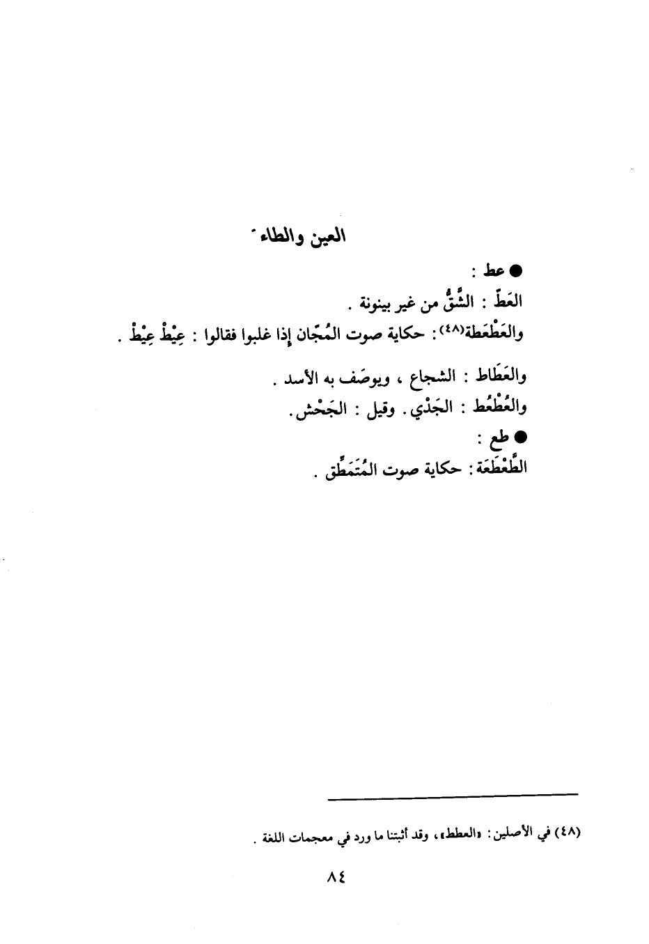 عط العَط : الشق من غير بينونة . والعطْعَطة : حكاية صوت المُجان إذا غلبوا فقالوا : عيْطْ عيْطْ . والعَطَاط : الشجاع ، ويوصَف به الأسد . والعُطعغط : الجدْي . وقيل : الجَحْش . طع الطعطَعَة : حكاية صوت الَمتمطق .