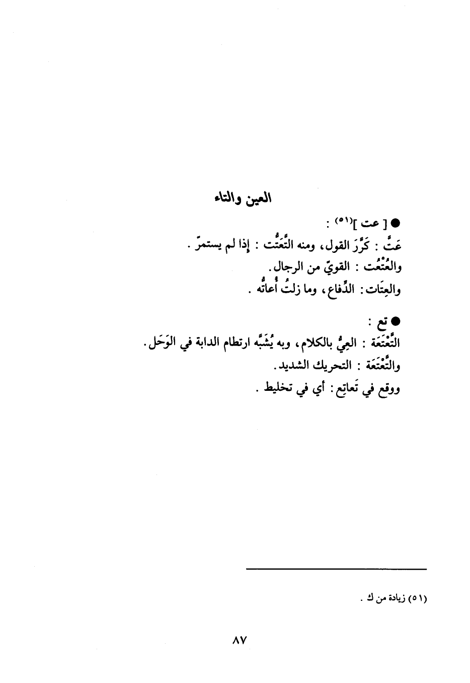 عت عَت : كررَ القول ، ومنه التًعَتت : إذا لم يستمرّ . والعُتْعُت : القوي من الرجال . والعِتَات : الدفاع ، وما زلتُ أعاتُّه . تع التعْتعة : العي بالكلام ، وبه يُشَبه ارتطام الدابة في الوحل . والتعْتَعَة : التحريك الشديد . ووقع في تعاتِع : أي في تخليط .
