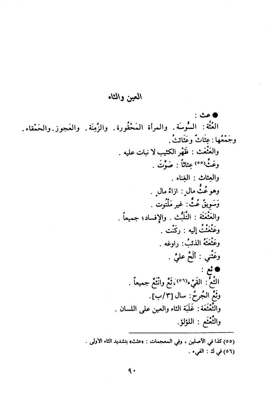 . عث : العُثَّة : السوسَة . والمرأة المَحْقُورة . والزمنة . والعجوز والحمقاء . جَمْعُها : عِثَاثٌ وعَثَائث . والعَثْعَث : ظَهْر الكثيب لا نبات عليه . وعَث عِثاثاً : صوتَ . والعِثاث : الغِناء . وهو عث مال : ازاءُ مال . وَسَوِيق عُثُّ : غير مَلْتُوت . والعَثْعَثَة : التلَبُّث . والإفساد ؛ جميعاً . وعَثْعَثْتُ إليه : ركَنْت . وعَثْعَثه الذئبُ : راوغه . وعَثني : ألح علي . ثع الثَّعُ : القَيْء ، ثَع وانْثع جميعاً . وثع الجُرحُ : سال . والثعْثَعَة : غَلَبَة الثاء والعين على اللسان . والثعْثع : اللؤلؤ .