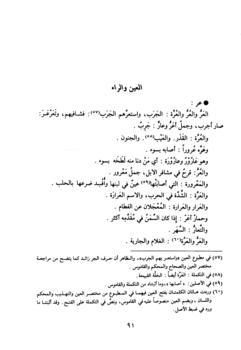 عر العَر والعُرُّ والعُرة : الجَرَب ، واستعرهم الجَرَب : فشا فيهم ، وتَعَرْعَرَ : صار أجرب ، وجملٌ أغر وعار : جَرب . والعرة : القَفر . والعَيْب . والجنون . وعَره عُريراً : أصابه بسوء . وهو عَارور وعارُورة : أي مَنْ دنا منه لَطَخَه بسوء . والعُرُّ : قرحٌ في مشافر الإبل ، جمل مَعْرور . والمَعْرورة : التي أصابَتْها عينَ في لبنها وأفْسِد ضرعها بالحلب . والعَرًة : الشدة في الحرب ، والاسم العَرارَة . والعَرار والعَرارة : المُعْجَلان عن الفطام . وحمار أعر : إذا كان السمَنُ في مُقَدمِه أكثر . والتعارْ : السهَر . والعَر والعرة : الغلام والجارية .