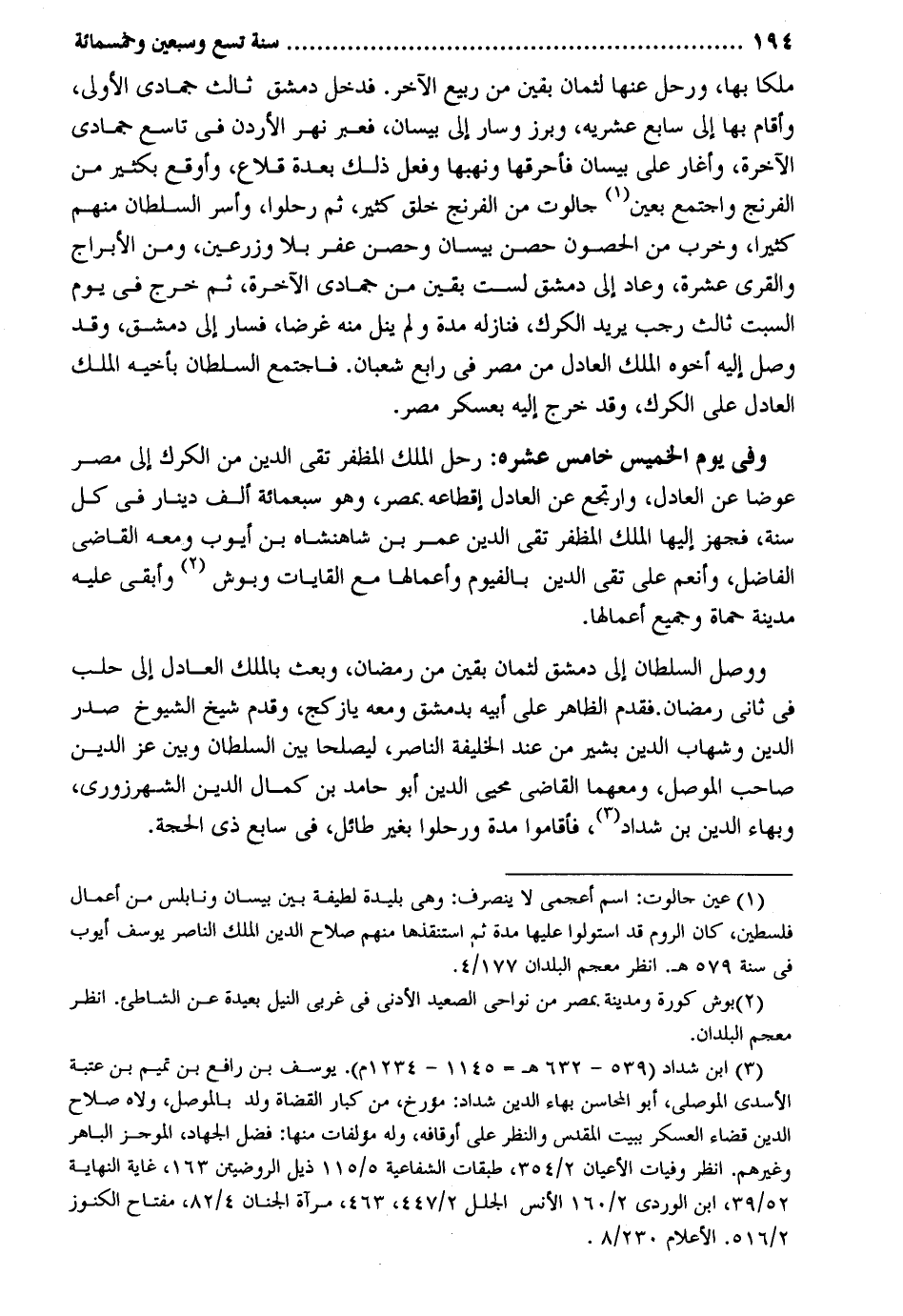 ملكا بهَا ورحل عَنْهَا لثمان بَقينَ من ربيع الآخر. فَدخل دمشق ثَالِث جُمَادَى الأولى وَأقَام بهَا إِلَى سَابِع عشريه وبرز وَسَار إِلَى بيسان فَعبر نهر الْأُرْدُن فِي تَاسِع جُمَادَى الْآخِرَة وأغار على بيسان فأحرقها ونهبها وَفعل ذَلِك بعدة قلاع وأوقع بِكَثِير من الفرنج وَاجْتمعَ بِعَين جالوت من الفرنج خلق كثير ثمَّ رحلوا وَأسر السُّلْطَان مِنْهُم كثيرا وَخرب من الْحُصُون حصن بيسان وحصن عفر بِلَا وزرعين وَمن الأبراج والقرى عشرَة وَعَاد إِلَى دمشق لست بَقينَ من جُمَادَى الْآخِرَة ثمَّ خرج فِي يَوْم السبت ثَالِث رَجَب يُرِيد الكرك فنازله مُدَّة وَلم ينل مِنْهُ عرضا فَسَار إِلَى دمشق وَقد وصل إِلَيْهِ أَخُوهُ الْملك الْعَادِل من مصر فِي رَابِع شعْبَان. فَاجْتمع السُّلْطَان بأَخيه الْملك الْعَادِل على الكرك وَقد خرج إِلَيْهِ بعسكر مصر. وَفِي يَوْم الْخَمِيس خَامِس عشره: رَحل الْملك المظفر تَقِيّ الدّين من الكرك إِلَى مصر عوضا عَن الْعَادِل وارتجع عَن الْعَادِل إقطاعه بِمصْر وَهُوَ سَبْعمِائة ألف دِينَار فِي كل سنة فَجهز إِلَيْهَا الْملك المظفر تَقِيّ الدّين عمر بن شاهنشاه بن أَيُّوب وَمَعَهُ القَاضِي الْفَاضِل وأنعم على تَقِيّ الدّين بالفيوم وأعمالها مَعَ القايات وبوش وَأبقى عَلَيْهِ مَدِينَة حماة وَجَمِيع أَعمالهَا. وَوصل السُّلْطَان إِلَى دمشق لثمان بَقينَ من رَمَضَان وَبعث بِالْملكِ الْعَادِل إِلَى حلب فِي ثَانِي رَمَضَان. فَقدم الظَّاهِر على أَبِيه بِدِمَشْق وَمَعَهُ يازكج وَقدم شيخ الشُّيُوخ صدر الدّين وشهاب الدّين بشير من عِنْد الْخَلِيفَة النَّاصِر ليصلحا بَين السُّلْطَان وَبَين عز الدّين صَاحب الْموصل ومعهما القَاضِي محيي الدّين أَبُو حَامِد بن كَمَال الدّين الشهرزورى وبهاء الدّين بن شَدَّاد فأقاموا مُدَّة ورحلوا بِغَيْر طائل فِي سَابِع ذِي الْحجَّة.