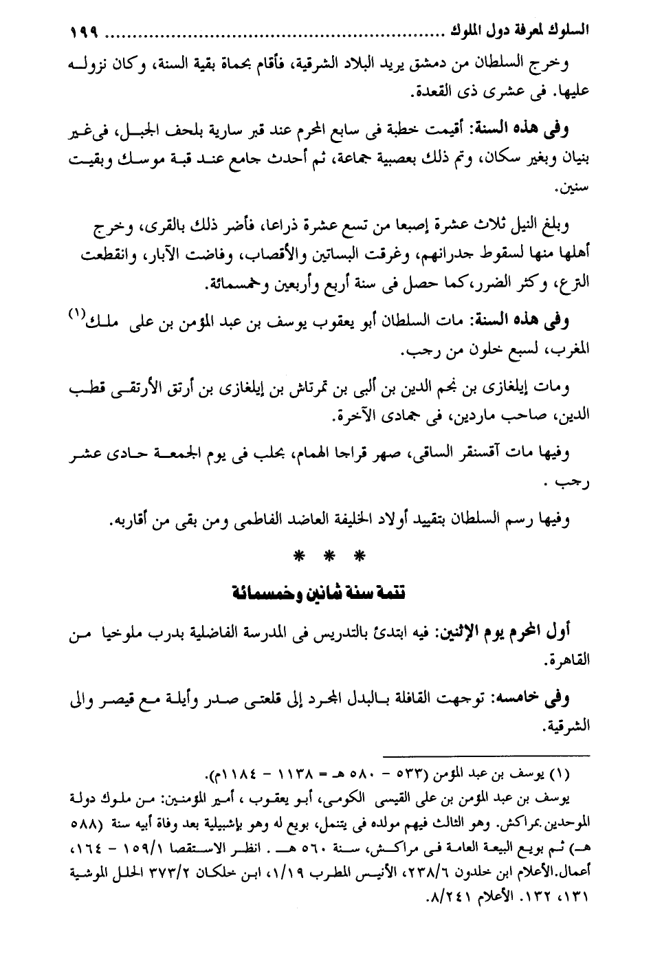 وَخرج السُّلْطَان من دمشق يُرِيد الْبِلَاد الشرقية فَأَقَامَ بحماة بَقِيَّة السّنة وَكَانَ نُزُوله عَلَيْهَا فِي عشري ذِي الْقعدَة. وَفِي هَذِه السّنة: أُقِيمَت خطْبَة فِي سَابِع الْمحرم عِنْد قبر سَارِيَة بلحف الْجَبَل فِي غير بُنيان وَبِغير سكان وَتمّ ذَلِك بعصبية جمَاعَة ثمَّ أحدث جَامع عِنْد قبَّة موسك وَبقيت سِنِين. وَبلغ النّيل ثَلَاث عشرَة إصبعا من تسع عشرَة ذِرَاعا فأضر ذَلِك بالقرى وَخرج الترع وَكثر الضَّرَر كَمَا حصل فِي سنة أَربع وَأَرْبَعين وَخَمْسمِائة. وَفِي هَذِه السّنة: مَاتَ السُّلْطَان أَبُو يَعْقُوب يُوسُف بن عبد الْمُؤمن بن عَليّ ملك الْمغرب لسبع خلون من رَجَب. وَمَات إيلغازي بن نجم الدّين بن ألبي بن تمرتاش بن إيلغازي بن أرتق الأرتقي قطب الدّين صَاحب ماردين فِي جُمَادَى الْآخِرَة. وفيهَا مَاتَ آقسنقر الساقي صهر قراجا الْهمام بحلب فِي يَوْم الْجُمُعَة حادي عشر وفيهَا رسم السُّلْطَان بتقييد أَوْلَاد الْخَلِيفَة العاضد الفاطمي وَمن بَقِي من أَقَاربه. تَتِمَّة سنة ثَمَانِينَ وَخَمْسمِائة أول الْمحرم يَوْم الْإِثْنَيْنِ: فِيهِ ابتدئ بالتدريس فِي الْمدرسَة الْفَاضِلِيَّةِ بدرب ملوخيا من الْقَاهِرَة. وَفِي خامسه: تَوَجَّهت الْقَافِلَة بِالْبَدَلِ الْمُجَرّد إِلَى قلعتي صدر وأيلة مَعَ قَيْصر وَالِي الشرقية.