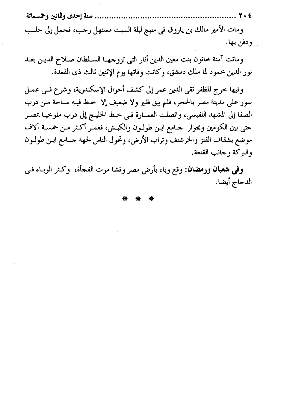 وَمَات الْأَمِير مَالك بن ياروق فِي منبج لَيْلَة السبت مستهل رَجَب محمل إِلَى حلب وَدفن بهَا. وَمَاتَتْ آمِنَة خاتون بنت معِين الدّين أنار الَّتِي تزَوجهَا السُّلْطَان صَلَاح الدّين بعد نور الدّين مَحْمُود لما ملك دمشق وَكَانَت وفاتها يَوْم الِاثْنَيْنِ ثَالِث ذِي الْقعدَة. وفيهَا خرج المظفر تَقِيّ الدّين عمر إِلَى كشف أَحْوَال الْإسْكَنْدَريَّة وَشرع فِي عمل سور على مَدِينَة مصر بِالْحجرِ فَلم يبْق فَقير وَلَا ضَعِيف إِلَّا خطّ فِيهِ ساحة من درب الصَّفَا إِلَى المشهد النفيسي واتصلت الْعِمَارَة فِي خطّ الخليج إِلَى درب ملوخيا بِمصْر حَتَّى بَين الكومين وبجوار جَامع ابْن طولون والكبش فعمر أَكثر من خَمْسَة آلَاف مَوضِع بشقاف القنز والخرشتف وتراب الأَرْض وتحول النَّاس لجِهَة جَامع ابْن طولون وَالْبركَة وجانب القلعة. وَفِي شعْبَان ورمضان: وَقع وباء بِأَرْض مصر وَفَشَا موت الْفجأَة وَكثر الوباء فِي الدَّجَاج أَيْضا.