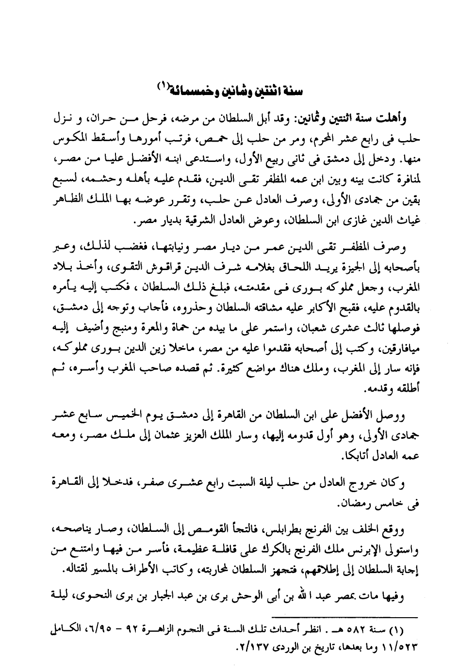 سنة اثْنَتَيْنِ وَثَمَانِينَ وَخَمْسمِائة وأهلت سنة اثْنَتَيْنِ وَثَمَانِينَ: وَقد أبل السُّلْطَان من مَرضه فَرَحل من حران وَنزل حلب فِي رَابِع عشر الْمحرم وَمر من حلب إِلَى حمص فرتب أمورها واسقط المكوس لمنافرة كَانَت بَينه وبن ابْن عَمه المظفر تَقِيّ الدّين فَقدم عَلَيْهِ بأَهْله وحشمه لسبع بَقينَ من جُمَادَى الأولى وَصرف الْعَادِل عَن حلب ولقرر عوضه بهَا الْملك الظَّاهِر غياث الدّين غَازِي ابْن السُّلْطَان وَعوض الْعَادِل الشرقية بديار مصر. وَصرف المظفر تَقِيّ الدّين عمر من ديار مصر ونيابتها فَغَضب لذَلِك وَعبر بِأَصْحَابِهِ إِلَى الجيزة يُرِيد اللحاق بغلامه شرف الدّين قراقوش التَّقْوَى وَأخذ بِلَاد الْمغرب وَجعل مَمْلُوكه بوري فِي مقدمته فَبلغ ذَلِك السُّلْطَان فَكتب إِلَيْهِ يَأْمُرهُ بالقدوم عَلَيْهِ فقبح الأكابرعليه مشاقته السُّلْطَان وَحَذرُوهُ فَأجَاب وَتوجه إِلَى دمشق فوصلها ثَالِث عشري شعْبَان وَاسْتمرّ على مَا بِيَدِهِ من حماة والمعرة ومنبج وأضيف إِلَيْهِ ميافارقين وَكتب إِلَى أَصْحَابه فقدموا عَلَيْهِ من مصر ماخلا زين الدّين بوري مَمْلُوكه فَإِنَّهُ سَار إِلَى الْمغرب وَملك هُنَاكَ مَوَاضِع كنيرة. ثمَّ قَصده صَاحب الْمغرب وأسره ثمَّ أطلقهُ وَقدمه. وَوصل الْأَفْضَل على ابْن السُّلْطَان من الْقَاهِرَة إِلَى دمشق يَوْم الْخَمِيس سَابِع عشر جُمَادَى الأولى وَهُوَ أول قدومه إِلَيْهَا وَسَار الْملك الْعَزِيز عُثْمَان إِلَى ملك مصر وَمَعَهُ عَمه الْعَادِل أتابكا. وَكَانَ خُرُوج الْعَادِل من حلب لَيْلَة السبت رَابِع عشري صفر فدخلا إِلَى الْقَاهِرَة فِي خَامِس رَمَضَان. وَوَقع الْخلف بَين الفرنج بطرابلس فالتجأ القومص إِلَى السُّلْطَان وَصَارَ يناصحه وَاسْتولى الإبرنس ملك الفرنج بالكرك على قافلة عَظِيمَة فَأسر من فِيهَا وَامْتنع من إِجَابَة السُّلْطَان إِلَى إِطْلَاقهم فتجهز السُّلْطَان لمحاربته وَكَاتب الْأَطْرَاف بِالْمَسِيرِ لقتاله. وفيهَا مَاتَ بِمصْر عبد الله بن أبي الْوَحْش بري بن عبد الْجَبَّار بن بري النَّحْوِيّ لَيْلَة