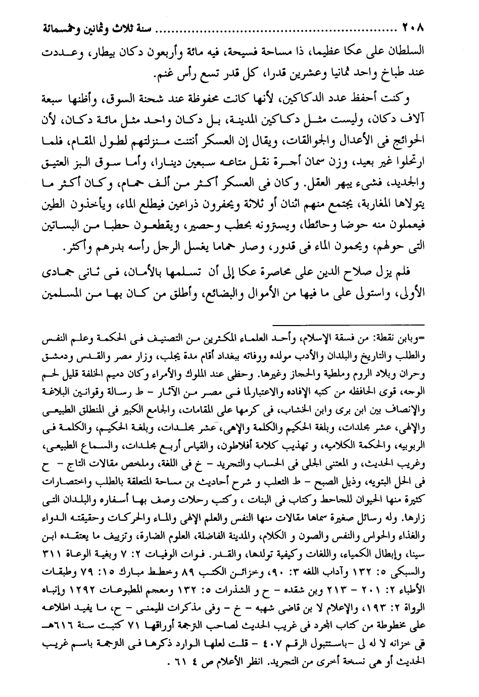 السُّلْطَان على عكا عَظِيما ذَا مساحة فسيحة فِيهِ مائَة وَأَرْبَعُونَ دكان بيطار وعددت عِنْد طباخ وَاحِد ثمانيا وَعشْرين قدرا كل قدر تسع رَأس غنم. وَكنت أحفظ عدد الدكاكين لِأَنَّهَا كَانَت مَحْفُوظَة عِنْد شحنه السُّوق وأظنها سَبْعَة آلَاف دكان وَلَيْسَت مثل دكاكين الْمَدِينَة بل دكان وَاحِد مثل مائَة دكان لِأَن الْحَوَائِج فِي الأعدال والجوالقات وَيُقَال إِن الْعَسْكَر أنتنت مَنْزِلَتهمْ لطول الْمقَام فَلَمَّا ارتحلوا غير بعيد وزن سمان أُجْرَة نمل مَتَاعه سبعين دِينَارا وَأما سوق الْبَز الْعَتِيق والجديد فشيء يبهر الْعقل. وَكَانَ فِي الْعَسْكَر اكثر من ألف حمام وَكَانَ أَكثر مَا يتولاها المغاربة يجْتَمع مُتَّهم اثْنَان أَو ثَلَاثَة ويحفرون ذراعين فَيطلع المَاء وَيَأْخُذُونَ الطين فيعملون مِنْهُ حوضا وحائطا ويسترونه بحطب وحصير ويقطعون حطبا من الْبَسَاتِين الَّتِي حَولهمْ ويحمون المَاء فِي قدور وَصَارَ حَماما يغسل الرجل رَأسه بدرهم وَأكْثر. فَلم يزل صَلَاح الدّين على محاصرة عكا إِلَى أَن تسلمها بالأمان فِي ثَانِي جُمَادَى الأولى وَاسْتولى على مَا فِيهَا من الْأَمْوَال والبضائع وَأطلق من كَانَ بهَا من الْمُسلمين