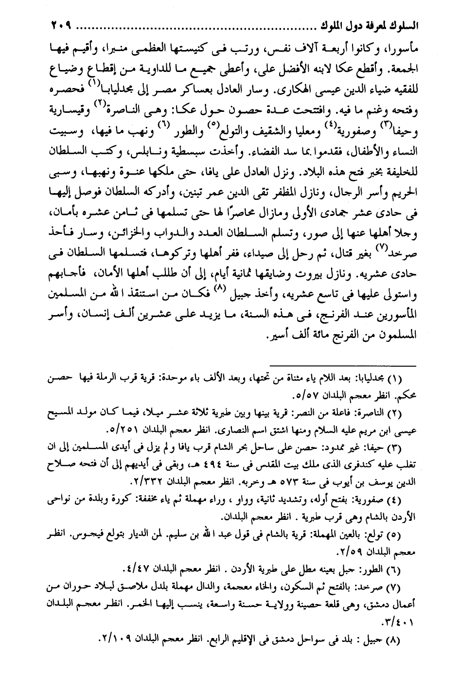 مأسورا وَكَانُوا أَرْبَعَة آلَاف نفس ورتب فِي كنيستها الْعُظْمَى منبرا وأقيم فِيهَا الْجُمُعَة. وأقطع عكا لِابْنِهِ الْأَفْضَل على وَأعْطى جَمِيع مَا للداوية من إقطاع وضياع للفقيه ضِيَاء الدّين عِيسَى الهكاري. وَسَار الْعَادِل بعساكر مصر إِلَى مجدليابا فحصره وفتحه وغنم مَا فِيهِ. وافتتحت عدَّة حصون حول عكا: وَهِي الناصرة وقيسارية وحيفا وصفورية ومعليا والشقيف والتولع وَالطور وَنهب مَا فِيهَا وسبيت للخليفة بِخَبَر فتح هَذِه الْبِلَاد. وَنزل الْعَادِل على يافا حَتَّى ملكهاعنوة ونهبها وسبى الْحَرِيم وَأسر الرِّجَال ونازل المظفر تَقِيّ الدّين عمر تبنين وأدركه السُّلْطَان فوصل إِلَيْهَا فِي حادي عشر جُمَادَى الأولى ومازال محاصرا لَهَا حَتَّى تسلمها فِي ثامن عشره بِأَمَان وجلا أَهلهَا عَنْهَا إِلَى صور وتسلم السُّلْطَان الْعدَد وَالدَّوَاب والخزائن وَسَار فَأخذ صرخد بِغَيْر قتال ثمَّ رَحل إِلَى صيداء ففر أَهلهَا وتركوها فتسلمها السُّلْطَان فِي حادي عشريه. ونازل بيروت وضايقها ثَمَانِيَة أَيَّام إِلَى أَن طلب أَهلهَا الْأمان فأجابهم وَاسْتولى عَلَيْهَا فِي تَاسِع عشريه وَأخذ جبيل فَكَانَ من استنقذ الله من الْمُسلمين المأسورين عِنْد الفرنج فِي هَذِه السّنة مَا يزِيد على عشْرين ألف إِنْسَان وَأسر الْمُسلمُونَ من الفرنج مائَة ألف أَسِير.