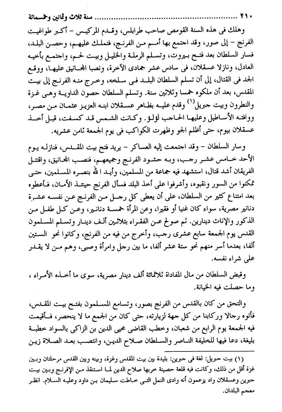 وَهلك فِي هَذِه السّنة القومص صَاحب طرابلس وَقدم المركيس أكبر طواغيت الفرنج إِلَى صور وَقد اجْتمع بهَا أُمَم من الفرنج فتملك عَلَيْهِم وحصن الْبَلَد فَسَار السُّلْطَان بعد فتح بيروت وتسلم الرملة والخليل وَبَيت لحم وَاجْتمعَ بأَخيه الْعَادِل ونازلا عسقلان فِي سادس عشر جُمَادَى الْآخِرَة ونصبا المجانيق عَلَيْهَا وَوَقع الْجد فِي الْقِتَال إِلَى أَن تسلم السُّلْطَان الْبَلَد فِي سلخه وَخرج مِنْهُ الفرنج إِلَى بَيت الْمُقَدّس بعد أَن ملكوه خمْسا وَثَلَاثِينَ سنة. وتسلم السُّلْطَان حصون الداوية وَهِي غَزَّة والنطرون وَبَيت جِبْرِيل وَقدم عَلَيْهِ بِظَاهِر عسقلان ابْنه الْعَزِيز عُثْمَان من مصر ووافته الأساطيل وَعَلَيْهَا الْحَاجِب لُؤْلُؤ. وَكَانَت الشَّمْس قد كسفت قبل أَخذ عسقلان بِيَوْم حَتَّى أظلم الجو وَظَهَرت الْكَوَاكِب فِي يَوْم الْجُمُعَة ثامن عشريه. وَسَار السُّلْطَان وَقد اجْتمعت إِلَيْهِ العساكر يُرِيد فتح بَيت الْمُقَدّس فنازله يَوْم الْأَحَد خَامِس عشر رَجَب وَبِه حشود الفرنج وجميعهم فنصب المجانيق واقتتل الْفَرِيقَانِ أَشد قتال اسْتشْهد فِيهِ جمَاعَة من الْمُسلمين وأيد الله بنصره الْمُسلمين حَتَّى تمكنوا من السُّور ونقبوه وأشرفوا على أخد الْبَلَد فَسَأَلَ الفرنج حِينَئِذٍ الْأمان فَأَعْطوهُ بعد امْتنَاع كثير من السُّلْطَان على أَن يعْطى كل رجل من الفرنج عَن نَفسه عشرَة دَنَانِير مصرية سَوَاء كَانَ غَنِيا أَو فَقِيرا وَعَن الْمَرْأَة خَمْسَة دَنَانِير وَعَن كل طِفْل من الذُّكُور وَالْإِنَاث دينارين. ئم صولح عَن الْفُقَرَاء بِثَلَاثِينَ ألف دِينَار وتسلم الْمُسلمُونَ الْقُدس يَوْم الْجُمُعَة سَابِع عشري رَجَب وَأخرج من فِيهِ من الفرنج وَكَانُوا نَحْو السِّتين ألفا بَعْدَمَا أسر مِنْهُم نَحْو سِتَّة عشر ألفا مابين رجل وَامْرَأَة وَصبي وهم من لايقدر على شِرَاء نَفسه. وَقبض السُّلْطَان من مَال المفاداة ثَلَاثمِائَة ألف دِينَار مصرية سوى مَا أَخذه الْأُمَرَاء وَمَا والتحق من كَانَ بالقدس من الفرنج بصور وتسامع الْمُسلمُونَ بِفَتْح بَيت الْمُقَدّس فَأتوهُ رجَالًا وركابنا من كل جِهَة لزيارته حَتَّى كَانَ من الْجمع مَالا ينْحَصر فأقيمت فِيهِ الْجُمُعَة يَوْم الرَّابِع من شعْبَان وخطب القَاضِي محيي الدّين بن الزاكي بِالسَّوَادِ خطْبَة بليغة دَعَا فِيهَا للخليفة النَّاصِر وَالسُّلْطَان صَلَاح الدّين وانتصب بعد الصَّلَاة زين