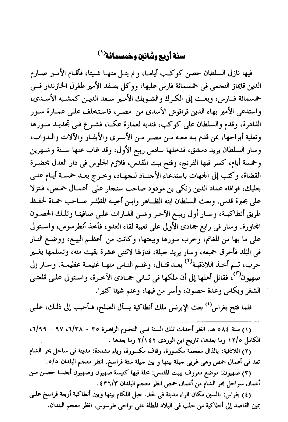 سنة أَربع وَثَمَانِينَ وَخَمْسمِائة فِيهَا نَازل السُّلْطَان حصن كَوْكَب أَيَّامًا وَلم ينل مِنْهَا شَيْئا فَأَقَامَ الْأَمر صارم الدّين قايماز النجمي فِي خَمْسمِائَة فَارس عَلَيْهَا ووكل بصفد الْأَمِير طغرل الخازندار فِي خَمْسمِائَة فَارس وَبعث إِلَى الكرك والشوبك الْأَمِير سعد الدّين كمشبه الْأَسدي واستدعى الْأَمِير بهاء الدّين قراقوش الْأَسدي من مصر فاستخلف على عمَارَة سور الْقَاهِرَة وَقدم وَالسُّلْطَان على كَوْكَب فندبه لعمارة عكا فشرع فِي تَجْدِيد سورها وتعلية أبراجها بِمن قدم بِهِ مَعَه من مصر من الأسرى والأبقار والآلات وَالدَّوَاب وَسَار السُّلْطَان يُرِيد دمشق فَدَخلَهَا سادس ربيع الأول وَقد غَابَ عَنْهَا سنة وشهرين وَخَمْسَة أَيَّام كسر فِيهَا الفرنج وَفتح بَيت الْمُقَدّس فلازم الْجُلُوس فِي دَار الْعدْل بِحَضْرَة الْقُضَاة وَكتب إِلَى الْجِهَات باستدعاء الأجناد للْجِهَاد وَخرج بعد خَمْسَة أَيَّام على بعلبك فوافاه عماد الدّين زنكي بن مودود صَاحب سنجار على أَعمال حمص فَنزلَا على بحيرة قدس. وَبعث السُّلْطَان ابْنه الظَّاهِر وَابْن أَخِيه المظفر صَاحب حماة لحفظ طَرِيق أنطاكية وَسَار أول ربيع الآخر وَشن الغارات على صافيتا وَتلك الْحُصُون الْمُجَاورَة. وَسَار فِي رَابِع جُمَادَى الأولى على تعبية لِقَاء الْعَدو فَأخذ أنطرسوس وَاسْتولى على مَا بهَا من الْمَغَانِم وَخرب سورها وبيعتها وَكَانَت من أعظم البيع وَوضع النَّار فِي الْبَلَد فَأحرق جَمِيعه وَسَار يُرِيد جبلة فنازلها لِاثْنَتَيْ عشرَة بقيت مِنْهُ وتسلمها بِغَيْر حَرْب ثمَّ أَخذ اللاذقية بعد قتال وغنم النَّاس مِنْهَا غنيمَة عَظِيمَة. وَسَار إِلَى صهيون فقاتل أَهلهَا إِلَى أَن ملكهَا فِي ثَانِي جُمَادَى الْآخِرَة وَاسْتولى على قلعتي الشغر وبكاس وعدة حصون وَأسر من فِيهَا وغنم شَيْئا كثيرا. فَلَمَّا فتح بغراس بعث الإبرنس ملك أنطاكية يسْأَل الصُّلْح فَأُجِيب إِلَى ذَلِك على