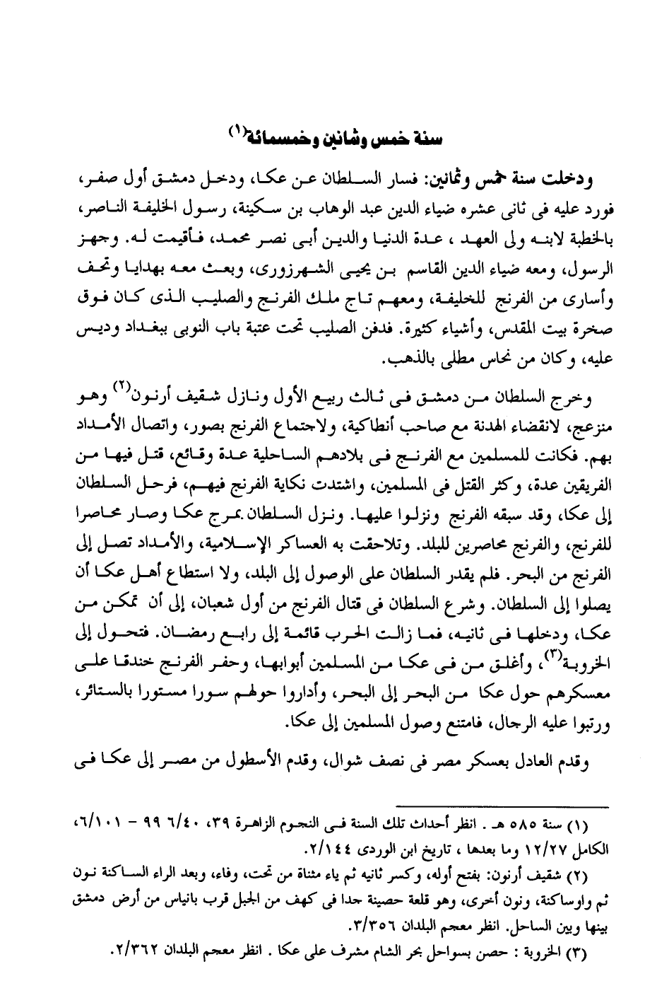 وَدخلت سنة خمس وَثَمَانِينَ: فَسَار السُّلْطَان عَن عكا وَدخل دمشق أول صفر فورد عَلَيْهِ فِي ثَانِي عشره ضِيَاء الدّين عبد الْوَهَّاب بن سكينَة رَسُول الْخَلِيفَة النَّاصِر بِالْخطْبَةِ لِابْنِهِ ولي الْعَهْد عدَّة الدُّنْيَا وَالدّين أبي نصر مُحَمَّد فأقيمت لَهُ. وجهز الرَّسُول وَمَعَهُ ضِيَاء الدّين الْقَاسِم بن يحيى الشهرزوري وَبعث مَعَه بِهَدَايَا وتحف وأسارى من الفرنج للخليفة وَمَعَهُمْ تَاج ملك الفرنج والصليب الَّذِي كَانَ فَوق صَخْرَة بَيت الْمُقَدّس وَأَشْيَاء كَثِيرَة. فَدفن الصَّلِيب تَحت عتبَة بَاب النوبى بِبَغْدَاد وديس عَلَيْهِ وَكَانَ من نُحَاس مَطْلِي بالنهب. وَخرج السُّلْطَان من دمشق فِي ثَالِث ربيع الأول ونازل شقيف أرنون وَهُوَ منزعج لانقضاء الْهُدْنَة مَعَ صَاحب أنطاكية ولاجتماع الفرنج بصور واتصال الأمداد بهم فَكَانَت للْمُسلمين مَعَ الفرنج فِي بِلَادهمْ الساحلية عدَّة وقائع قتل فِيهَا من الْفَرِيقَيْنِ عدَّة وَكثر الْقَتْل فِي الْمُسلمين واشتدت نكاية الفرنج فيهم فَرَحل السُّلْطَان إِلَى عكا وَقد سبقه الفرنج ونزلوا عَلَيْهَا. وَنزل السُّلْطَان بمرج عكا وَصَارَ محاصرا للفرنج والفرنج محاصرين للبلد. وتلاحقت بِهِ العساكر الإسلامية والأمداد تصل إِلَى الفرنج من الْبَحْر. فَلم يقدر السُّلْطَان على الْوُصُول إِلَى الْبَلَد وَلَا اسْتَطَاعَ أهل عكا أَن يصلوا إِلَى السُّلْطَان. وَشرع السُّلْطَان فِي قتال الفرنج من أول شعْبَان إِلَى أَن تمكن من عكا ودخلها فِي ثَانِيه فَمَا زَالَت الْحَرْب قَائِمَة إِلَى رَابِع رَمَضَان. فتحول إِلَى الخروبة وأغلق من فِي عكا من الْمُسلمين أَبْوَابهَا وحفر الفرنج خَنْدَقًا على معسكرهم حول عكا من الْبَحْر إِلَى الْبَحْر وأداروا حَولهمْ سورا مَسْتُورا بالستائر ورتبوا عَلَيْهِ الرِّجَال فَامْتنعَ وُصُول الْمُسلمين إِلَى عكا. وَقدم الْعَادِل بعسكر مصر فِي نصف شَوَّال وَقدم الأسطول من مصر إِلَى عكا فِي