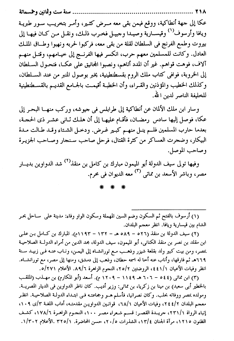 عكا إِلَى جِهَة أنطاكية وَوَقع فِيمَن بَقِي مَعَه مرض كثير وَأمر بتخريب سور طبرية ويافا وأرسوف وقيسارية وصيدا وجبيل فخرب ذَلِك وَنقل من كَانَ فِيهَا إِلَى بيروت وطمع الفرنج فِي السُّلْطَان لقلَّة من بَقِي مَعَه فَرَكبُوا لحربه ونهبوا وطاق الْملك الْعَادِل. وَكَانَت للْمُسلمين مَعَهم حَرْب انْكَسَرَ فِيهَا الفرنج إِلَى خيامهم وَقتل مِنْهُم آلَاف فوهت قواهم. غير أَن المدد أَتَاهُم ونصبوا المجانيق على عكا فتحول السُّلْطَان إِلَى الحزوبة فَوَافى كتاب ملك الرّوم بقسطنطينية يخبر بوصول الْمِنْبَر من عِنْد السُّلْطَان وَكَذَلِكَ الْخَطِيب والمؤذنين والقراء وَأَن الْخطْبَة أُقِيمَت وَسَار ابْن ملك الألمان عَن أنطاكية إِلَى طرابلس فِي جيوشه وَركب مِنْهَا الْبَحْر إِلَى عكا فوصل إِلَيْهَا سادس رَمَضَان فَأَقَامَ عَلَيْهَا إِلَى أَن هلك ثَانِي عشر ذِي الْحجَّة بَعْدَمَا حَارب الْمُسلمين فَلم ينل مِنْهُم كَبِير عرض. وَدخل الشتَاء وَقد طَالَتْ مُدَّة البيكار وضجرت العساكر من كَثْرَة الْقِتَال فَرَحل صَاحب سنجار وَصَاحب الجزيرة وَصَاحب الْموصل. وفيهَا تولى سيف الدولة أَبُو الميمون مبارك بن كَامِل بن منقذ شدّ الدَّوَاوِين بديار مصر وباشر الأسعد بن مماتي مَعَه الدِّيوَان فِي محرم.