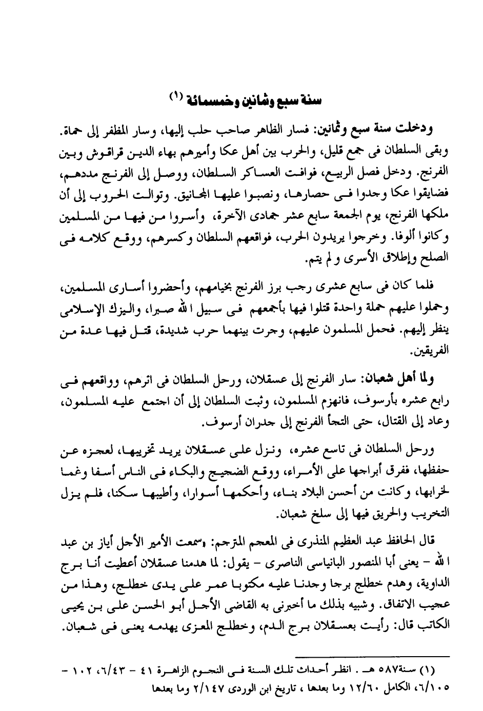 سنة سبع وَثَمَانِينَ وَخَمْسمِائة وَدخلت سنة سبع وَثَمَانِينَ: فَسَار الظَّاهِر صَاحب حلب إِلَيْهَا وَسَار المظفر إِلَى حماة. وَبَقِي السُّلْطَان فِي جمع قَلِيل وَالْحَرب بَين أهل عكا وَأمرهمْ بهاء الدّين قراقوش وَبَين الفرنج. وَدخل فصل الرّبيع فوافت العساكر السُّلْطَان وَوصل إِلَى الفرنج مددهم فضايقوا عكا وجدوا فِي حصارها ونصبوا عَلَيْهَا المجانيق. وتوالت الحروب إِلَى أَن ملكهَا الفرنج يَوْم الْجُمُعَة سَابِع عشر جُمَادَى الْآخِرَة وأسروا من فِيهَا من الْمُسلمين وَكَانُوا ألوفا. وَخَرجُوا يُرِيدُونَ الْحَرْب فواقعهم السُّلْطَان وكسرهم وَوَقع كَلَامه فِي فَلَمَّا كَانَ فِي سَابِع عشري رَجَب برز الفرنج بخيامهم وأحضروا أُسَارَى الْمُسلمين وحملوا عَلَيْهِم حَملَة وَاحِدَة قتلوا فِيهَا بأجمعهم فِي سَبِيل الله صبرا واليزك الإسلامي ينظر إِلَيْهِم. فَحمل الْمُسلمُونَ عَلَيْهِم وَجَرت بَينهمَا حَرْب شَدِيدَة قتل فِيهَا عدَّة من الْفَرِيقَيْنِ. وَلما أهل شعْبَان: سَار الفرنج إِلَى عسقلان ورحل السُّلْطَان فِي أَثَرهم وواقعهم فِي رَابِع عشره بأرسوف فَانْهَزَمَ الْمُسلمُونَ وَثَبت السُّلْطَان إِلَى أَن اجْتمع عَلَيْهِ الْمُسلمُونَ وَعَاد إِلَى الْقِتَال حَتَّى التجأ الفرنج إِلَى جدران أرسوف. ورحل السُّلْطَان فِي تَاسِع عشره وَنزل على عسقلان يُرِيد تخريبها لعَجزه عَن حفظهَا فَفرق أبراجها على الْأُمَرَاء وو قع الضجيج والبكاء فِي النَّاس أسفا وغما لخرابها وَكَانَت من أحسن الْبِلَاد بِنَاء وأحكمها أسوارا وأطيبها سكنا فَلم يزل التخريب والحريق فِيهَا إِلَى سلخ شعْبَان. قَالَ الْحَافِظ عبد الْعَظِيم الْمُنْذِرِيّ فِي المعجم المترجم: سَمِعت الْأَمِير الْأَجَل أياز بن عبد الله يعْنى أَبَا الْمَنْصُور البانياسي الناصري يَقُول: لما هدمنا عسقلان أَعْطَيْت أَنا برج الداوية وَهدم خطلج برجا وجدنَا عَلَيْهِ مَكْتُوبًا عمر على يَدي خطلج وَهَذَا من الْكَاتِب قَالَ: رَأَيْت بعسقلان برج الدَّم وخطلج المعزى يهدمه يَعْنِي فِي شعْبَان.