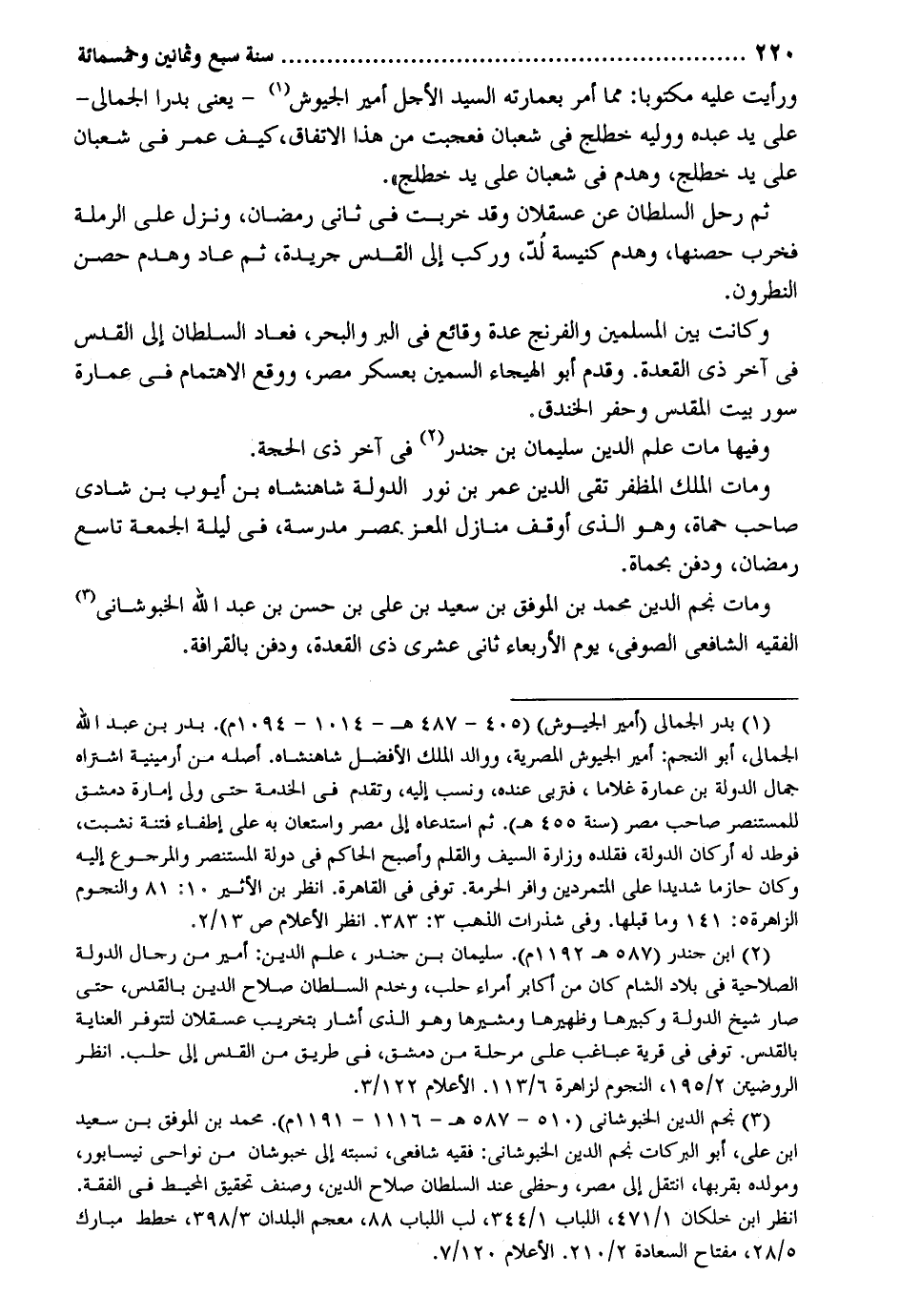 وَرَأَيْت عَلَيْهِ مَكْتُوبًا: مِمَّا أَمر بعمارته السَّيِّد الْأَجَل أَمِير الجيوش يعْنى بَدْرًا الجمالي على يَد عَبده ووليه خطلج فِي شعْبَان فعجبت من هَذَا الِاتِّفَاق كَيفَ عمر فِي شعْبَان على يَد خطلج وَهدم فِي شعْبَان على يَد خطلج. ثمَّ رَحل السُّلْطَان عَن عسقلان وَقد خربَتْ فِي ثَانِي رَمَضَان وَنزل على الرملة فخرب حصنها وسم كَنِيسَة لد وَركب إِلَى الفدس جَرِيدَة ثمَّ عَاد وَهدم حصن النطرون. وَكَانَت بَين الْمُسلمين والفرنج عدَّة وقائع فِي الْبر وَالْبَحْر فَعَاد السُّلْطَان إِلَى الْقُدس فِي آخر ذِي الْقعدَة. وَقدم أَبُو الهيجاء السمين بعسكر مصر وَوَقع الاهتمام فِي عمَارَة سور بَيت الْمُقَدّس وحفر الخَنْدَق. وفيهَا مَاتَ علم الدّين سُلَيْمَان بن جندر فِي آخر ذِي الْحجَّة. وَمَات الْملك المظفر تَقِيّ الدّين عمر بن نور الدولة شاهنشاه بن أَيُّوب بن شادي صَاحب حماة وَهُوَ الَّذِي أوقف منَازِل الْمعز بِمصْر مدرسة فِي لَيْلَة الْجُمُعَة تَاسِع رَمَضَان وَدفن بحماة. وَمَات نجم الدّين مُحَمَّد بن الْمُوفق بن سعيد بن عَليّ بن حسن بن عبد الله الخبوشاني الْفَقِيه الشَّافِعِي الصُّوفِي يَوْم الْأَرْبَعَاء ثَانِي عشري ذِي الْقعدَة وَدفن بالقرافة.