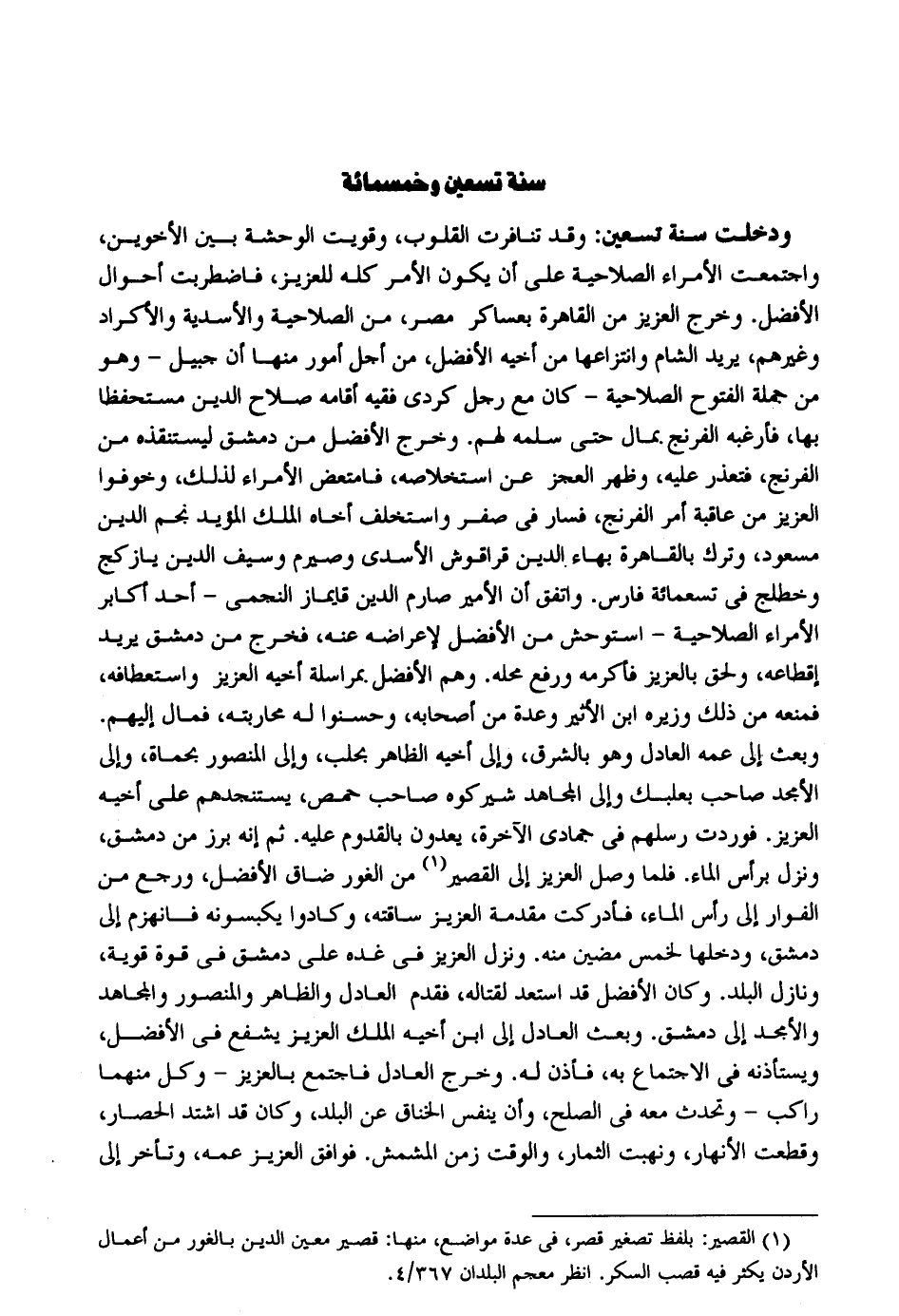 وَدخلت سنة تسعين: وَقد تنافرت الْقُلُوب وقويت الوحشة بَين الْأَخَوَيْنِ وَاجْتمعت الْأُمَرَاء الصلاحية على أَن يكون الْأَمر كُله للعزيز فاضطربت أَحْوَال الْأَفْضَل. وَخرج الْعَزِيز من الْقَاهِرَة بعساكر مصر من الصلاحية والأسدية والأكراد وَغَيرهم يُرِيد الشَّام وانتزاعها من أَخِيه الْأَفْضَل من أجل أُمُور مِنْهَا أَن جبيل وَهُوَ من جملَة الْفتُوح الصلاحية كَانَ مَعَ رجل كردِي فَقِيه أَقَامَهُ صَلَاح الدّين مستحفظا بهَا فأرغبه الفرنج بِمَال حَتَّى سلمه لَهُم. وَخرج الْأَفْضَل من دمشق ليستنقذه من الفرثج فَتعذر عَلَيْهِ وَظهر الْعَجز عَن استخلاصه فامتعض الْأُمَرَاء لذَلِك وخوفوا الْعَزِيز من عَاقِبَة أَمر الفرنج فَسَار فِي صفر واستخلف أَخَاهُ الْملك الْمُؤَيد نجم الدّين مَسْعُود وَترك بِالْقَاهِرَةِ بهاء الدّين قراقوش الْأَسدي وصيرم وَسيف الدّين يازكج وخطلج فِي تِسْعمائَة فَارس. وَاتفقَ أَن الْأَمِير صارم الدّين قايماز النجمي أحد أكَابِر الْأُمَرَاء الصلاحية استوحش من الْأَفْضَل لإعراضه عَنهُ فَخرج من دمشق يُرِيد إقطاعه وَلحق بالعزيز فَأكْرمه وَرفع مَحَله. وهم الْأَفْضَل بمراسلة أَخِيه الْعَزِيز واستعطافه فَمَنعه من ذَلِك وزيره ابْن الْأَثِير وعدة من أَصْحَابه وحسنوا لَهُ محاربته فَمَال إِلَيْهِم. وَبعث إِلَى عَمه الْعَادِل وَهُوَ بالشرق وَإِلَى أَخِيه الظَّاهِر بحلب وَإِلَى الْمَنْصُور بحماة وَإِلَى الأمجد صَاحب بعلبك وَإِلَى الْمُجَاهِد شيركوه صَاحب حمص يستنجدهم على أَخِيه الْعَزِيز. فوردت رسلهم فِي جُمَادَى الْآخِرَة يعدون بالقدوم عَلَيْهِ. ثمَّ إِنَّه برز من دمشق وَنزل بِرَأْس المَاء. فَلَمَّا وصل الْعَزِيز إِلَى الْقصير من الْغَوْر ضَاقَ الْأَفْضَل وَرجع من الفوار إِلَى رَأس المَاء فأدركت مُقَدّمَة الْعَزِيز ساقته وكادوا يكبسونه فَانْهَزَمَ إِلَى دمشق ودخلها لخمس مضين مِنْهُ. وَنزل الْعَزِيز فِي غده على دمشق فِي قُوَّة قَوِيَّة ونازل الْبَلَد. وَكَانَ الْأَفْضَل قد استعد لقتاله فَقدم الْعَادِل وَالظَّاهِر والمنصور والمجاهد والأمجد إِلَى دمشق. وَبعث الْعَادِل إِلَى ابْن أَخِيه الْملك الْعَزِيز يشفع فِي الْأَفْضَل ويستأذنه فِي الِاجْتِمَاع بِهِ فَأذن لَهُ. وَخرج الْعَادِل فَاجْتمع بالعزيز وكل مِنْهُمَا رَاكب وتحدث مَعَه فِي الصُّلْح وَأَن ينفس الخناق عَن الْبَلَد وَكَانَ قد اشْتَدَّ الْحصار وَقطعت الْأَنْهَار ونهبت الثِّمَار وَالْوَقْت زمن المشمش. فَوَافَقَ الْعَزِيز عَمه وَتَأَخر إِلَى